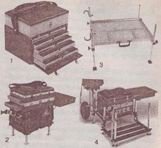 Рис. 9. Сиденья: 1 — рыболовный ящик-сиденье с отделениями для снастей; 2 — рыболовный ящик-сиденье на регулируемых по высоте ножках и столиком для снастей; 3 — простая платформа на регулируемых по высоте ножках; 4 — сложная модульная система «платформа-ящик — вспомогательные приспособления». Платформа. Это пик рыболовной фантазии и комфорта! Платформа представляет собой столик с четырьмя или шестью регулируемыми по высоте ножками (рис. 9, 3). На столике устанавливается то или иное сиденье (обычно ящик). Прелесть платформы в том, что ее можно устанавливать на любой поверхности, от наклонной бетонной набережной и откоса с крупными камнями до болотистого берега или сплавины. Все ножки у платформы регулируются по высоте. И еще одним преимуществом данной конструкции является возможность крепления к ней многих дополнительных приспособлений, как то: стойки для удилищ и для насадки, откидная полка под прикормочное ведро, держатель для удилища, когда оно находится не в руках (рис. 9, 4). Платформу можно дополнить столиком для снастей, на котором раскладываются коробка с оснастками, поводочница и другие мелочи. Тут ваша фантазия ничем не ограничена, кроме объема и веса багажа. Чем больше платформа, тем удобнее с нее ловить. Самые большие платформы крепятся на крышу легкового автомобиля, а самые маленькие помещаются в большой рюкзак. Размер такой маленькой платформы равен 50 сантиметрам по ширине и в длину — ширина ящика-сиденья плюс 30–35 сантиметров. Для такой небольшой платформы будет достаточно четырех ножек. Длина ножек может быть самой разной. Если вы не собираетесь навешивать на платформу дополнительное оборудование, то сверху длину ножек можно ограничить полом платформы. Ножки выполняются из дюралевых или титановых трубок, наружным диаметром около 1 сантиметра (примерно как лыжная палка). Пол платформы делается из листового металла (дюраль, титан) или прочного пластика. Для уменьшения веса пол платформы перфорируется (делаются отверстия в большом количестве). Это также помогает стоку воды и грязи с платформы обратно в водоем или на землю. Для прочности пол крепится к каркасу, сделанному из металлопроката квадратного сечения. Более подробно описывать конструкцию и технологию изготовления платформы не имеет смысла, так как человек, технически подготовленный, сам сможет все понять из рисунков и фотографий, а остальным можно посоветовать приобрести готовую платформу или вовсе отказаться от ее использования. Самая элементарная фирменная платформа (просто столик с четырьмя ножками, без ящика) стоит около 100 у.е. Далее цены возрастают достаточно резко, и приемлемая платформа с ящиком и некоторыми навесками стоит уже около 300–400 у.е. Дополнительные навески на платформу • С правой стороны на уровне ящика можно сделать полку для ведра с прикормкой. Полка делается откидная, с петлевым креплением. • На ножки, расположенные с левой стороны (или с правой — как вам удобнее), желательно установить держатели для удилища. Они имеют вид струбцины с U-образным окончанием. Это U-образное окончание желательно поместить в пластиковую оплетку для предохранения удилища от повреждений. Две такие струбцины, установленные на платформе, помогут вам освободить руки в момент заброса прикормки. На передней ножке струбцина устанавливается как буква «U», а на