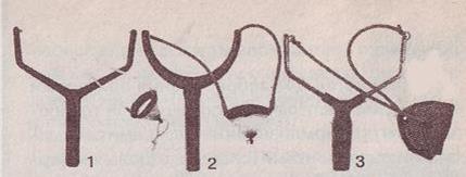Рис. 5. Фирменные подсачеки: 1— с круглым ободом и капроновой сеткой; 2-е овальным ободом и сеткой из лески; 3 — с овальным ободом и капроновой сеткой. Если сетку изготовить достаточно сложно (хотя и об этом будет рассказано ниже), то палку сделать очень легко из старой (например, ломаной) удочки. Лучше всего для этой цели подходят отечественные углепластиковые удилища («Волжанка», «Каскад»). В крайнем случае, можно использовать и дешевое «стекло». Я долгое время в качестве палки использовал три колена, начиная со второго, высококачественного японского удилища первоначальной длиной 7 метров. Если стоимость фирменной палки для подсачека сравнима с ценой удилища 5-6-метровой длины, то цена отечественного «угля» или китайского «стекла» на порядок ниже. Конечно, вы заведомо проигрываете фирменному изделию в качестве (легкости, удобству), но если подсаком вы пользуетесь нечасто (1–2 раза за рыбалку), то на нем вполне можно сэкономить. Достаточно удобной конструкцией соединения «сетка — палка» является система, когда обод сетки вставляется и закрепляется (вклеивается на эпоксидной смоле) в 15-20-сантиметровый отрезок колена от удилища. Этот отрезок подбирается таким образом, чтобы он штекерно насаживался на верхний конец папки-рукояти. Подобная система использовалась мною на протяжении более 5 лет и показала себя достаточно надежной и удобной. Для прочности желательно обмотать отрезок колена в месте вклейки обода изолентой или стекловолокном, пропитанной эпоксидной смолой. Обод для стойки можно сделать из алюминиевой проволоки или дюралевого прутка. Алюминиевую проволоку следует брать толщиной не менее 5–7 миллиметров, дюралевый же прут (или еще лучше трубку можно использовать меньшей толщины (3–5 миллиметров). Еще лучше, если в вашем распоряжении окажется титановый сплав. Он весьма легок и очень прочен и соответственно толщину прутка можно еще уменьшить, тем самым увеличив легкость и маневренность подсачека. Наиболее удобной формой обода является эллипс или окружность. Треугольная форма обода подсачека, так часто встречающаяся на прилавках наших магазинов, обусловлена не удобством использования, а удобством для складывания разборных подсачеков. Если круглый подсачек вы не складываете (он занимает максимум 50 х 50 см места в багаже рыболова), то треугольные складные подсачеки находятся в одном чехле с ручкой и могут перевозиться в футляре для удилищ. Эти подсачеки, во всяком случае, в других странах мира используются в карповой ловле и при ловле хищника. Сетку для самодельного подсака лучше сшить в форме низкого цилиндра — такая форма используется во всех фирменных изделиях. Средний стандартный размер сетки у фирменного подсачека таков: диаметр 45 миллиметров, высота 25 сантиметров, ячейка 5 миллиметров. Примерно то же самое хорошо бы сделать и вам. Размеры нити и ячейки сетки сильно сказываются на маневренности подсачека, повысить которую можно, либо увеличив размер ячейки в сетке, либо используя сетку из тонкой нитки, либо, и это лучше всего, используя сетку из лески. У такой сетки минимальное сопротивление воде. К сожалению, сетку из лески купить почти невозможно, а связать очень сложно. Поэтому фирменные лесковые подсачеки очень дороги. Чем больше размер ячеи подсака, тем лучше его маневренность, но у подсачека с сеткой, изготов