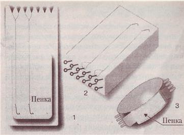 Рис. 8. Самодельные колодки для поводков: 1 — с пропилами под леску; 2-с держателями-булавками; 3 — «барабанная». Во втором варианте в качестве колодки используется брусок пенопласта (рис. 8, 2). С торца в него втыкаются почти по самую головку портновские булавки с шариком на конце. Петельку поводка цепляют за булавку, а крючок втыкают прямо в пенопласт. Такая колодка является двусторонней. Кстати, первый вариант также можно сделать двусторонним, сделав прорези с противоположных сторон и наклеив «пенку» на обратную сторону колодки. Оба варианта легки в изготовлении и достаточно удобны. Единственный минус этих колодок — невозможность хранения длинных поводков. Вы же не станете делать колодку длиной 40 сантиметров, а оборачивать поводок вокруг нее несколько раз нежелательно, так как на нем остаются перегибы от острых краев колодки. В продаже имеются так называемые «барабанные» колодки, которые имеют овальное сечение. Поводок просто накручивают несколько раз вокруг колодки (рис. 8, 3). Покупка фирменных пружинных колодок, у которых посадочное место для крепления либо крючка, либо петельки подпружинены и, следовательно, перемещаемы, на мой взгляд, нецелесообразна, так как те же функции легко выполняют более простые, любые из вышеописанных колодок. Очень полезно на колодку наклеить кусочек пластыря, на котором можно написать диаметр и марку лески и номер крючка. На любительскую рыбалку я вожу с собой три колодки (для лески диаметрами 0,08, 0,1 и 0,12 миллиметров). На каждой из колодок имеются поводки разной длины (от 10 до 25 сантиметров) и с разными крючками. Чтобы леска не деформировалась при закреплении на поводочнице, прорези в пластине необходимо отшлифовать. Транспортировать снаряженные колодки желательно в полиэтиленовом мешочке, последний легко помещается в коробку для оснасток, в которой можно сделать специальное отделение для колодок. Существует еще масса вариантов поводочниц, но говорить о них отдельно не имеет смысла. Просто, старайтесь хранить поводок в распрямленном виде и без контакта с жесткими материалами. СидениеВо-первых, как вы уже поняли, ловля в 90 % случаев производится сидя. Только при активной весенней ловле «в проводку» выгоднее ловить стоя. Или еще: на некоторых водоемах вы едва сможете просунуть удилище сквозь прибрежные заросли. Где уж тут устраивать себе удобное место для установки сидения. Но весенняя ловля — это практически всегда ловля удилищем с катушкой, а поскольку в книге мы в большинстве случаев рассматриваем «глухую» удочку, то и подробно разбирать случаи ловли стоя мы не будем. По опыту обучения начинающих рыболовов методам спортивной ловли, я знаю, как трудно такому человеку воспринять то, что сидя ловить удобнее. Поэтому перечислю минусы ловли стоя: • за любой вещью, необходимой постоянно (насадка, прикормка), вам приходится нагибаться, тем самым теряя контроль как над поплавком, так и над самим удилищем; Если я до сих пор не убедил вас, что ловить нужно сидя, то хотя бы попробуйте последовать моему совету и сравнить ловлю сидя и стоя. Существуют три основных вида сидений. Самый простой — стульчик, более громоздкий — ящик, и, наконец, пик комфорта — платформа. Стульчик. Это самый легкий и компактный вид сидения. Если вы ловите на отдаленных водоемах и не пользуетесь автотранспортом, проще говоря, если 