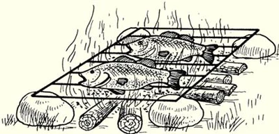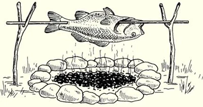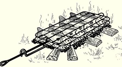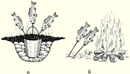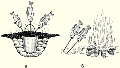 Рис. 7. Костер «полевой камин» Приготовление рыбы в походных условияхСекреты приготовления рыбы, известные с древних времен, до сих пор актуальны и вкусны. Самое вкусное блюдо - свежая рыба, приготовленная на костре. Даже такой известный гурман, как Денис Давыдов, предпочитал рыбу на шпажках. Сегодня рыбу можно приготовить разными способами: просто над огнем, на углях, в фольге или на гриле. Рис. 8. Жаренье на шпажках (шампурах): а – на углях; б – вблизи костра Рис. 9. Жаренье в углях Рис. 10. Жаренье на доске Рис. 11. Жаренье на вертеле Рис. 12. Жаренье на двойной решетке с ручкой (барбекю) Рис. 13. Жаренье крупной рыбы на решетке из металлической сетки © (А.В. Пышков, С.Г. Смирнов, С.А. Мурашова) | |