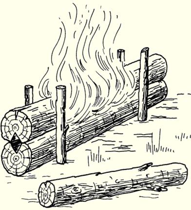 Как приготовить рыбу на костреЧеловечество накопило огромный опыт в разведении костров. Этот опыт необходимо учитывать. Прежде чем развести огонь, нужно выбрать подходящий тип костра, который будет безопасен для окружающей среды и соответствовать поставленной задаче. Разведение костра должно быть осознанным: огонь разводят только для конкретной цели. Костер «охотничий» («рыбацкий»)Для поддержания длительного обогрева используется костер, характеризующийся высокой теплоотдачей. Ключевым элементом конструкции является крупное полено, обеспечивающее непрерывное горение и служащее основным источником топлива (см. рис. 1).