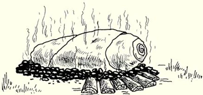 Костер «полинезийский»Чтобы подготовить место для данного костра, выкопайте яму глубиной 30-40 см и обложите ее поленьями. Разведите огонь из сухого хвороста в центре ямы. Когда дрова превратятся в угли, вы сможете приготовить вкусную еду, запекая мясо, картошку и рыбу в фольге (см. рис. 6).