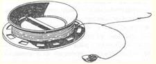 Рис. 5. Пенопласт, надетый на поводок балабайки Это суждение подтверждается не только при ловле со льда. Оползень на реке с быстрым течением, береговые кусты, ветви которых находятся в воде, безошибочно указывают место, где, забросив донку, вполне можно рассчитывать на успех. Конечно, шансы поймать большого леща значительно возрастут, если прикормить место. Рубленые черви, каша, распаренные зерна овса — далеко не все привады на леща. Только приваду обязательно нужно смешать с глиной и бросать крупными шарами вверх по течению так, чтобы, размыв глину, течение доставляло прикормку в избранное вами место. Найти место, где находится крупный лещ, не так-то просто. Но однажды Лещатник заявил, что теперь он не будет уходить далеко от машины в какую-то глухомань, а способ, который он взял на вооружение, позволит выудить леща из любого водоема, в котором тот водится, и, быть может, даже без предварительной прикормки. Сказав так много слов подряд, Лещатник победоносно посмотрел на меня, ожидая вопросов. Я, конечно, тут же высказался, что понаслышке знаком с этим способом, но пока ещё не успел разжиться динамитом. Характер Лещатника не допускал хоть какой-то дозы юмора в отношениях между людьми, занятых столь серьёзным делом. Открыв багажник машины, он показал на громадный мешок — вот, мол, смотри. «Удочка в клеточку, всё ясно. Сто метров будет в путанке?» — продолжал я наступление, скрывая свою недогадливость. В мешке оказался вполне обыкновенный морской песок. Отаборившись на месте, где порядочный рыболов остановится только для того, чтобы завязать некстати распустившийся узел на шнурках обуви, Лещатник заявил, что подобным образом будет ловить впервые, а потому вполне может случиться осечка. Пока я устанавливал палатку, он возился со своим мешком, постоянно насыпая в реку песок при помощи громадной жестянки из-под томатов. Об этом способе Лещатник, как выяснилось позже, узнал от одного из ста человек, с которыми общается ежедневно. Засыпая после плотного ужина, я все думал, как поведет себя Лещатник, если этот человек решил ненавязчиво пошутить. Ещё было темно, когда мой напарник выполз из палатки. Он долго колдовал с удочкой, и, наконец, в воду осторожно опустился сверхчувствительный лещовый поплавок, состоящий из двух половинок твердого пенопласта. Преимущество этой справы состоит в том, что самая незаметная поклевка точно даст сигнал к подсечке. Стоит нижней части поплавка чуть подняться вверх — верхняя половинка тут же плашмя ложится на воду. Так было и на этот раз. Лещатник довольно снисходительно посматривал в мою сторону, а на траве лежала рыба, очертаниями больше похожая на глося, нежели на леща. «Ради такого подлещика стоило возиться с песком?» — довольно равнодушным тоном спросил я, глядя на громадную рыбину и, не дожидаясь реакции напарника, начал быстро выдвигать колена своего телескопа. Лещатник научил меня многому. Но и мне, в свою очередь, довелось показать ему всю прелесть летнего лова на излюбленную снасть — мормышку. Способ, примененный Лещатником, оказался не по душе и ему: не рыбалка, а какая-то ловушка для рыбы, этот самодельный лещовый стол из песка. Способ надежен, особенно в сочетании с привадой, но ведь не всякий рыболов в состоянии волочить на себе такой мешочек, который мы с Лещатником, в общем-то, не обиженные силой, ел