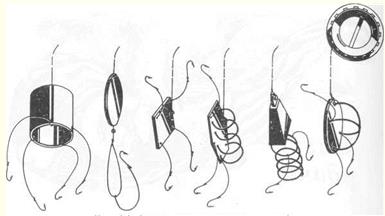 Рис. 1. Самоловы для карповых рыб Крупную рыбу нужно искать. И тут очень трудно придется тому, кто готов довольствоваться неплохим уловом, состоящим из рыб средних размеров. Сколько раз доводилось проходить по льду мимо рыболовов, азартно вытаскивающих из лунок небольших окуньков-«матросиков» и радующихся такой удаче после периода глухозимья. Но раз клев активен, можно поискать окуня и покрупнее. В такой день, как правило, поиск рано или поздно принесет настоящих горбачей. Если вы попали на место, где активен клев некрупной рыбы, сумейте перебороть себя и ищите другое. Как-то на озере Путрино по перволедью неподалеку от камышей активно клевал окунь средних размеров. Почти все мормышечники столпились в одном месте. Мы пошли вдоль линии камышей дальше и, просверлив не один десяток лунок, в конце концов, нашли стаю горбачей, размеры которых вполне смогли удовлетворить даже такого привередливого любителя крупной рыбы, как мой напарник. Словом, если вы попадаете на место, где одна за другой ловятся мелкие рыбешки, без сожаления смените его, ищите крупную рыбу и ваш поиск будет, рано или поздно, вознагражден. Однако самый надёжный способ поймать крупную рыбу — это настроиться только на неё, приготовив соответствующие снасти. Волга, Южный Буг, Днепр, Дунай, Турунчук, Днестр — реки, где вы можете попробовать свои силы в поединке с сомом. Мне не приходилось ловить и даже видеть, каким образом охотятся на сома с помощью квока. Расскажу о снастях и наживках, которые используют для поимки сома местные рыболовы. В глубоких, захламленных ямах, неподалеку от омутов, обитает рыба, достигающая гигантских размеров и внушительного веса. Ученые полагают, что 250 килограммов — не самый рекордный вес этого речного исполина. Правда, если вы вступите в многочасовую борьбу со стокилограммовой рыбой, вам может показаться, что в ней минимум тонна. Но, откровенно говоря, таких сомов мне не доводилось ни ловить, ни видеть. Однако, как знать, быть может, вам повезет больше. Летом, когда начинает спадать вода, теплыми ночами можно приступать к рыбалке, успех которой зависит от правильно выбранного места, наживки и, конечно же, справы. Только для встречи с сомом вы должны обязательно приготовить багор. Именно багор, а не багорик, которым можно извлечь из воды крупного судака и огромную щуку. Леска большого диаметра, минимум 1 мм, или капроновый шнур, скользящее грузило весом 200–300 граммов и специальный крючок, который можно приобрести — сами уже знаете где. Обратите внимание на тщательную подвязку крючка к этой закидушке. Если вы будете ловить на живца, от скользящего грузила лучше отказаться в пользу традиционного, потому что живец в данном случае — это лягушка, средний окунь. Живцы таких размеров свободно будут стаскивать леску с катушки. Неплохой наживкой считается выползок — их нужно надевать на крючок по нескольку штук, медведка в сочетании с пучком крупных червей, кишки домашних птиц. Эти насадки не считаются в наших краях самыми лучшими, хотя они давным-давно зарекомендовали себя как надежные помощники в охоте на сома. Секрет изготовления «колобка», в состав которого входят тесто, мёд, орешки, жмых, кишки птицы и другие компоненты, мне так и не удалось записать. Однако довелось быть свидетелем, когда громадный сом был взят именно на такую наживку. Размером это
