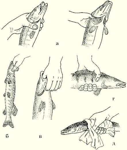 Меры сохранения рыбыУдержание рыбыУдержание рыбы всегда требует от рыболова умелых и решительных действий. Довольно распространена ситуация, когда в силу неопытности или даже излишней робости только что пойманная рыба бьется о землю или дно лодки под ногами рыболова. И когда ее наконец-то удается взять в руки, для длительного хранения в садке она уже не годится. Да и кулинарные качества рыбы заметно снижаются. Практически вся мирная рыба, независимо от размеров и веса, после извлечения из воды решительно захватывается со стороны спины за жаберными крышками. Чем сильнее бьется и сопротивляется рыба, тем сильнее должен быть ее захват. При этом рыболов должен помнить, что если рыбу предполагается длительное время хранить в садке, то смещать захват в сторону жаберных крышек, а особенно под жабры, недопустимо. И наоборот, в случае, если рыба в срочном порядке готовится к сковородке и для хранения не предназначена, нажим на примыкающую к жабрам полость должен быть довольно сильным. Подобный захват позволяет без проблем извлечь крючок даже из пищевода. В дальнейшем рыба, предназначенная для потрошения, умерщвляется и складывается в прохладном месте. Хищная рыбаРыболову следует помнить, что вся хищная рыба весом более 2 кг, помимо острых, а иногда и внушительных по размеру, клыков и верхнего колючего плавника (судак), многоярусных, изогнутых вовнутрь туловища зубов (щука) и острых как бритва зазубрин по периметру жаберных крышек (окунь), имеет и ряд дополнительных колючек и шипов на жаберных крышках, жаберной мякоти (органы дыхания) и части туловища, примыкающей к голове. Поэтому крупные экземпляры хищника желательно брать в руки в хлопчатобумажных перчатках с элементами защиты от зубов и колючек в виде пластиковых выступов (бугорков). Хищную рыбу до 2 кг удерживают так же как и рыбу семейства карповые, дополнительно при захвате надавливая на глазницы (рис. 1). И, тем не менее, крупную хищную рыбу сажают на кукан (прокалывают нижнюю челюсть булавкой кукана), когда последняя находится в подсачеке в лодке. Очень крупные экземпляры, которые невозможно завести в лодку, прижимают мордой и брюхом к борту лодки или выводят на мелководье, после чего сажают на кукан. Если рыболов видит, что подведенная к борту лодки рыба измотана после длительного сопротивления и временно не проявляет признаков агрессивности (накапливая силу для дальнейшей борьбы), то умелый рыболов способен не спеша посадить рыбу на кукан и привязать его к борту лодки. В этом случае пришедшей в себя рыбе уже никогда не вырваться на свободу. Рис. 1. Удержание рыбы: а – мелкую и среднюю щуку; б - щуку за глазницы; в – линя, леща, густеру; г – берша, окуня, судака. необходимо обхватить голову, постепенно смещая руку к хвосту. Жабры и спинной плавник прижимают к туловищу; д – Угря и налима с помощью х/б ткани или газеты Прокол булавкой кукана нижней челюсти судака или щуки, как правило, вызывает достаточно запоздалую реакцию. Если кукан прочный, то сорваться с него рыба не в состоянии, так как по контуру ее челюстей проходят мощные кости, прорвать которые невозможно. Внимание! Практически у всех хищных рыб при захвате жертвы для ее скорейшего умерщвления в пасти выделяются ядовитые вещества. Поэтому контакт с клыками судака или зубами щуки крайне болезненный, а иногда и опасный для жизни