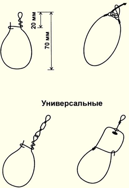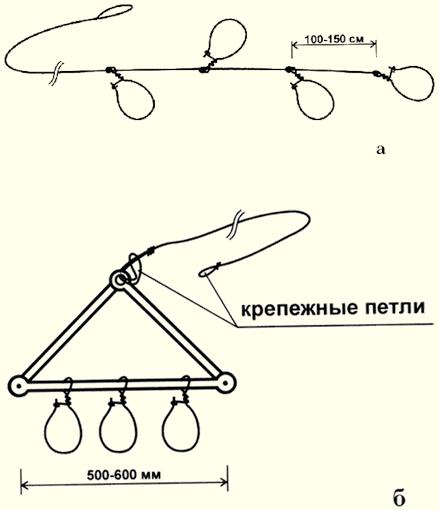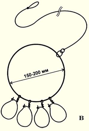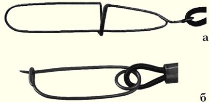 Рис. 2. Виды куканов: а – лодочный, много-застежечный; б – треугольный; в – кольцевой Фото 1. Куканы бортовые (лодочные): а – сферический; б – булавочный Рис. 3. Варианты застежек кукана Рыболов должен знать, что чем больше рыбы у него на кукане, тем меньше ее жизнеспособность. Береговые куканы всегда длиннее лодочных. В отдельных случаях длина шнура берегового кукана может доходить до 10 метров, естественно, если дно чистое. Щука, посаженная на береговой кукан длиной более 1,5 метров, способна прожить в течение нескольких недель. Если у вас нет фирменного кукана, его всегда можно изготовить из подручных средств. Простейший кукан изготавливают из проволоки, лучше всего медной или алюминиевой. Кусок проволоки длиной примерно в 20–25 см на концах закручивают в два колечка. В нижней челюсти хищной рыбы ножом протыкают прорезь, сквозь которую пропускают кукан, сгибают его и кольцами подвязывают метр-другой капронового шнура или толстой жилки. Свободный конец шнура привязывают либо к ветке кустарника, висящего над водой, либо к колу, специально для этого вбитого в дно водоема. Можно в целях маскировки прикрепить кукан к камню или какому-либо другому грузу, который не сможет утянуть рыба. Кукан помещают на глубину не менее полуметра в тени куста или дерева. Как уже говорилось, хищную рыбу ни в коем случае нельзя держать в обычном рыболовном садке. Пытаясь прорвать сетку, хищник скоро выбивается из сил и погибает в тесном садке. Если его оставить в воде, он очень скоро испортится. Не следует держать улов и на дне лодки. Во-первых, невыпотрошенная снулая рыба быстро протухнет, а во-вторых, бившийся долгое время о дно лодки хищник, как утверждают знатоки-гурманы, теряет свои вкусовые качества. Если по каким-то причинам нет возможности держать рыбу на кукане, то лучше всего ее сразу же умерщвить, проколов ножом голову у самого основания. Сразу умерщвленная рыба сохраняется значительно лучше, нежели та, что уснула от удушья. Если погода очень жаркая и нет кукана, то для надежности лучше всего умерщвленную рыбу незамедлительно выпотрошить, удалить жабры, а затем втереть под чешую и насыпать в брюшную полость соль крупного помола. Подсоленную таким образом рыбу следует уложить в садок или в корзину, переложив тушки крапивой или лопухом. Корзину надо держать в сухом затененном, продуваемом ветром месте. В таком виде рыба благополучно сохранится даже в жаркий день. Хранение рыбы в садкахГлавная ошибка начинающих рыболовов заключается в том, что они пытаются в скромный по габаритам садок втиснуть большое количество самой разнообразной пойманной рыбы. На самом же деле при хорошем кислородном режиме в непроточном водоеме в сетчатом садке с ячейкой 15х15 мм объемом 0,5 м3в течение трех часов можно сохранить живыми не более 50-ти густерок весом 120 г каждая. Давно известно, что крупную, особенно широкоспинную рыбу, лучше всего хранить в садках из капроновой сетки с ячейкой не менее 25х25 мм. Размер ячейки подбирается из расчета габаритов рыбы. Критерий следующий: голова рыбы не должна проходить в ячейку, тем более застревать в ней жабрами. В металлических мелкоячеистых садках рыба весом больше 1 кг вообще долго не живет, так как сетка-рабица обдирает у нее чешую, быстро забивается слизью, отчего кислородооб-мен резко нарушается. Периодическое встряхивание садка д