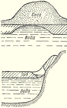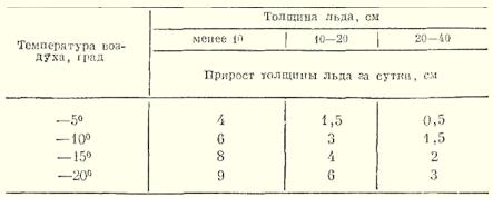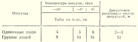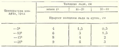 Рис. 1. Опасности на льду Опытные рыбаки, основываясь на многолетнем опыте, разработали свод правил безопасности при ловле со льда и всегда соблюдают осторожность: Нельзя выходить на лед толщиной менее 5 см. Прежде чем ступить на лед, необходимо проверить его прочность и толщину ударом пешни. Лед, покрытый снегом, опасен. Передвигаться по нему нужно особенно внимательно. При появлении трещин следует немедленно, но спокойно, не отрывая ног от льда, мелкими шагами отойти от опасного места. Нельзя останавливаться на участках с трещинами или тонким льдом. После морозов лед обычно крепкий, но оттепель его ослабляет. Нельзя выходить на лед толщиной менее 8 см, так как оттепель делает его рыхлым и непрочным. В табл. 1 и 2 приводятся данные прироста толщины льда (по К. Панфилову). Таблица 1 Первыми под лед уходят мелкие водоемы, такие как пруды и небольшие озера, поскольку они быстрее теряют тепло. В отличие от них, большие и глубокие водоемы, а также реки с течением, остывают медленнее, и лед на них появляется с задержкой до двух-трех недель. Эта разница в скорости замерзания наблюдается и внутри одного водоема: над глубокими участками лед образуется позже, чем над мелководьем. На реках толщина ледяного покрова напрямую связана с силой течения – чем оно интенсивнее, тем тоньше лед. Важно помнить, что прозрачный, темный лед является более прочным, чем белый или мутный. Однако следует проявлять особую бдительность в отношении участков с очень темным льдом, особенно если они украшены кристаллами инея или морозными узорами. Такие места часто указывают на наличие ключей или родников под льдом, что делает его крайне ненадежным. Появление тонкого слоя снега, пропитанного водой, выступающей из-под льда, может затемнять участки над родниками и ключами, а также на реках с сильным течением. Темные пятна возле ранее пробитых лунок обычно легко идентифицируются по следам или остаткам льда. Если же темное пятно не имеет явных признаков человеческой деятельности, его следует избегать, проявляя максимальную осторожность. Таблица 2 Для успешной зимней рыбалки крайне важна правильная экипировка, обеспечивающая тепло и комфорт. Особое внимание следует уделить обуви: выбирайте валенки на один-два размера больше обычных. Перед использованием новые валенки стоит укрепить, подшив их и обшив задники кожей. Поверх валенок надевайте глубокие галоши или, что еще лучше, чуни. Ноги должны быть хорошо утеплены: на голую ногу наденьте шерстяные носки, а поверх них – трикотажные. Не менее важна теплая одежда. Предпочтение отдавайте шерстяному нижнему белью, например, "егерскому". Верхняя одежда должна быть функциональной: ватные или меховые брюки с высоким поясом, закрывающим поясницу и нижнюю часть спины. Идеальным вариантом будет меховой полушубок, ватная куртка или бушлат. Длинная одежда не подходит, так как она быстро намокает и может обледенеть. Не забудьте про теплый шарф, свободную шапку-ушанку и меховые рукавицы, которые лучше закрепить на шнурке, продетым через рукава верхней одежды. Для удобства работы с наживкой пригодятся шерстяные перчатки без пальцев (большого, указательного и среднего). Если путь к месту рыбалки долгий, важно предусмотреть возможность регулировки одежды, чтобы избежать перегрева и потливости. В этом случае можно временно заменить ушан