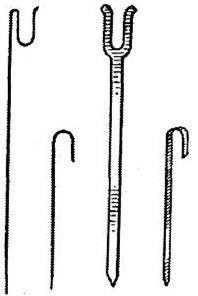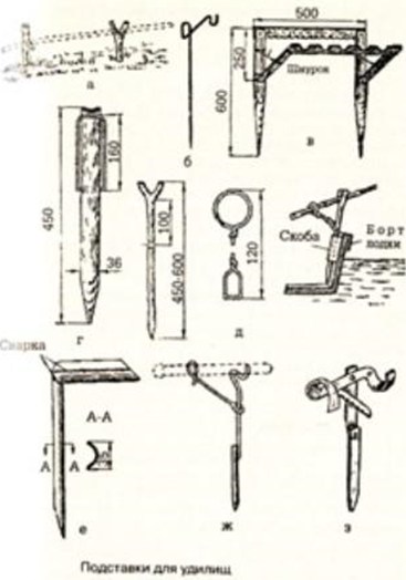Экстрактор можно изготовить и из деревянной палочки (см. рис., позиция б). Существуют конструкции экстракторов из проволоки, оканчивающейся спиралью или металлическим разрезным колечком (см. рис., позиция г).В спираль должны проходить колечко или лопаточка крючка. Такие экстракторы удобны тем, что введенные в них лески не выскальзывают. Существующие экстракторы в виде плоской вилочки с лобовым и боковым надрезом или в форме продолговатой, подрезанной по бокам оливы на ручке имеют недостаток, обусловленный тем, что при извлечении изо рта рыбы уже освобожденного крючка он иногда снова вонзается в ткань в другом месте. Для освобождения крючка или блесны из пасти хищной рыбы используют зевник (см. рис., позиция д). Его можно изготовить из стальной проволоки диаметром 3—4 мм, согнутой в пружинящую спираль. Концы зевника сжимают и вводят в рот рыбы. Раздвинутый силой пружины зевник держит рот рыбы открытым. Ну, а если экстрактор и зевник отсутствуют, а поймалась крупная щука, не следует пытаться раскрыть ей пасть и голыми руками достать крючок или блесну. Лучше достать из кармана перочинный нож и на всякий случай пробить в голове у щуки 3— 4 отверстия сверху, между глазами. Нужно подождать, пока она «трепыхнется» в последний раз, после чего можно заняться извлечением крючка (блесны) из пасти. Подставки для удочкиЧтобы не класть на воду удочки, отчего они быстро портятся, надо пользоваться специальными подставками. Их можно сделать из любого материала и различной формы, используя сучья, две щечки, металлические пластины или стальную проволоку. Настоящий рыболов, заботящийся о сохранении своих снастей, имеет постоянные подставки и носит их в рюкзаке. Всевозможные конструкции подставок для удилищ приведены на рисунке. Простейшая подставка — деревянная рогулька с крючком, поддерживающим комели удилища (а). Подставка может быть выполнена из стальной проволоки, желательно из нержавеющей стали (б). Диаметр проволоки для подставки 4—6 мм.