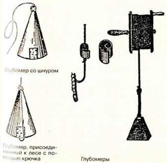 Подсачеки и багорики Обод можно сделать из трех шарнирно соединенных металлических прутков, к рукоятке обод прикрепляют болтом и гайкой. Один из прутков обода можно заменить шнуром (б). Простотой изготовления и легкостью отличается подсачек, показанный на рисунке в позиции (г). Бамбуковая рукоятка оканчивается вилкой из металлических трубок. В вилку вставляют бамбуковые пруты диаметром до 10 мм с натянутой на них сеткой. Третью сторону подсачека образует шнур. После сборки шнур необходимо туго натянуть, а пруты немного согнуть при натяжении шнура. В этом случае подсачек приобретает достаточную жесткость, чтобы выдержать вес крупной рыбы. А для того, чтобы вынуть один из прутьев, необходимо подогнуть к нему другой и ослабить натяжение шнура. При ловле рыбы, связанной с передвижением вдоль берега на значительные расстояния, лучше пользоваться складывающимся телескопическим подсачеком треугольной формы, а при ловле в забродку, например, хариуса — пользоваться коротким овальным подсачеком, закрепленным на резинке. При ловле крупных щук и сазанов подсачек в диаметре должен иметь не менее 45 см и сетка подсачека должна быть соответственно выполнена более глубокой, чтобы в нее поместилась рыба на 2/3 своей длины. При пользовании подсачеком бывают и небольшие неприятности — сухая нитчатая сеть его всплывает при погружении в воду, мешая подвести подсачек под засеченную рыбу и извлечь ее из воды. Чтобы избежать таких моментов, ко дну сетки подсачека прикрепляют кусочек свинца овальной формы, который сразу же погружает его. БагорикВо время ловли часто приходится пользоваться багориком (см. рис., позиции д—ж). Особенно он необходим при вываживании крупной рыбы. Зимой применяется багорик меньших размеров, чем летом. А делают его из большого крючка, прикрепленного к деревянной рукоятке. Длина рукоятки должна быть такой, чтобы можно было зацепить крупную рыбу при любой толщине льда. Особенно это необходимо при ловле крупной рыбы зимой. Лучше всего длину рукоятки багорика делать составной, чтобы можно было его разобрать для укладки в рыболовный ящик. Если же рукоятка багорика короткая, то к ней обязательно должен быть привязан шнур. ГлубомерПрежде чем приступить к подледной ловле на мормышку, необходимо определить глубину под лункой. Если снасть хорошо отрегулирована, то глубину укажет сторожок: он выпрямится и леска начнет морщинить. Но если лунка пробурена на глубоком месте, да еще с донным течением, следует воспользоваться глубомером. Если этого не сделать, то можно допустить грубую ошибку: течение будет относить легкую мормышку, «удлиняя» леску. Глубомер отливается из свинца и имеет коническую или пирамидальную форму. В нижнюю его часть вставлена пробка для крючка, а в верхнюю впаяно колечко для пропуска лески. Вес глубомера небольшой -- 100—200 г. При ловле на кружки к глубомеру привязывают шнур с разметкой на метры. При ловле других рыб глубомером пользуются без шнура — его присоединяют с помощью крючка к леске.
