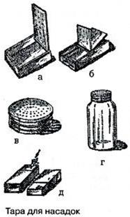 В продаже есть куканы, изготовленные из цепочки с застежками для нескольких рыб (в). Тара для насадокЧервяка, мотыля, мормыша просто так в карман не положишь. А если и положишь, то на рыбалке не найдешь — червяки, например, до того ползучие, что даже из консервной банки улизнуть умудряются. Поэтому для хранения всякой мелкой «живности» требуется тара специальная — чтобы и с крышечкой, и с отверстиями для воздуха. Чаще всего животные насадки хранят в деревянных коробочках. Дерево летом предохраняет от перегрева, а зимой — от переохлаждения. В крышках деревянных коробок обязательно должны быть предусмотрены мелкие отверстия (20—30 отверстий диаметром до 1 мм) для воздуха. Промышленность выпускает мотыльницы двух видов: с одним или двумя отделениями (см. рис., позиции а, б). В продаже встречаются и круглые пластмассовые коробочки с двумя крышками (в). В таких коробках донышко расположено посредине, и это позволяет хранить две разные наживки.