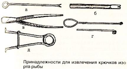 Оригинальный глубомерВ качестве глубомера можно использовать грузило в форме оливки со сквозным отверстием по длине. Такие грузила продаются в магазинах, торгующих рыболовными принадлежностями. На одном из концов «оливки» по торцу делают продольный разрез глубиной 5—7 мм. Края разреза зачищают наждачной шкуркой или надфилем. Закрепляют «оливку»-глубомер следующим образом: конец лески или поводка с крючком складывают петлей и протягивают через продольное отверстие в оливке так, чтобы крючок поддевом лег на кромку разреза, а жало крючка свободно выходило наружу. После этого протянутую через канал петлю захлестывают за один из рожков разреза и затягивают до устранения слабины. Удочка подготовлена для определения глубины. Если увеличить диаметр продольного отверстия «оливки» сверлом диаметром 2,5—3 мм, то пользоваться таким глубомером станет удобнее. Чтобы смягчить удары глубомера о дно, на закрепленную «оливку» натягивают резиновую трубочку длиной 3 см, внутренний диаметр которой меньше внешнего диаметра «оливки». ЭкстракторЭкстрактор служит для извлечения блесны или крючка изо рта рыбы, когда невозможно сделать это пальцами. Не только щука глубоко заглатывает приманку (особенно если очень голодна), но и окунь, судак, особенно в преднерестовый жор. Поворачивая и слегка нажимая на экстрактор, крючок освобождают и извлекают из пасти рыб (благодаря зацепу его за край экстрактора). Экстракторы можно изготовить различных модификаций, но лучше их делать из пружинной проволоки диаметром 2—3 мм. Края вилочки экстракторе (см. рис., позиция а) не должны быть острыми, чтобы не подрезать леску.