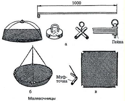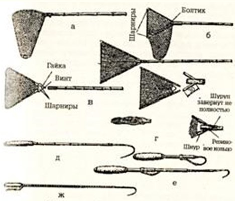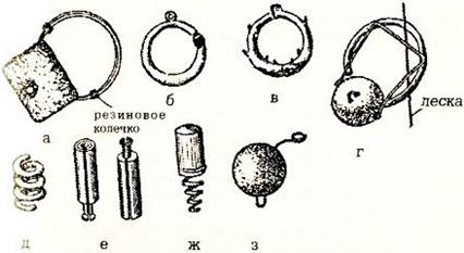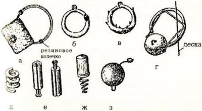 В качестве отцепа некоторые рыболовы применяют висячий замок с круглой дужкой. При пропуске лески в дужку замок отпирается. Если замок легкий, его можно подгрузить. Опущенный к месту зацепа на прочном шнуре, замок дужкой ударяет по поддеву крючка и освобождает его. Конструкции оригинальных отцепов приведены на рисунке. Отцеп, например, можно сделать из раздвижного кольца для ключей, приделав к нему груз весом 20—30 г. Для предотвращения выскальзывания лески из кольца следует надеть два отрезка ниппельной резинки, закрывающих щели (а). Его необходимо привязать к тонкому капроновому шнуру или толстой леске, намотанной на мотовильце из фанеры. Для освобождения крупных крючков на толстых лесках можно использовать металлическое кольцо весом 100—150 г. На него следует надеть кольцо из тонкой эластичной резины, которое предотвратит выскальзывание лески (б). По такому же принципу построен отцеп с шипами для извлечения травы или коряги, за которую зацепился крючок (в). Существует также конструкция шарового отцепа (г), который состоит из грузила в форме шара с петелькой, за которую привязывают шнур. В грузило одним концом заделана круглая скоба, а выше ее шарнирно закреплена прямоугольная рамка, пружинкой прижимаемая к скобе. Отогнув прямоугольную рамку, леску заводят в скобу через прорезь. Затем планку отпускают, и она не дает выскользнуть леске. Для освобождения крючков и блесен на зимней рыбалке используют также трубчатый отцеп (е), который состоит из свинцового цилиндра. В цилиндре свободно вращается коротенькая трубочка диаметром около 6 мм. Леску через пропил вводят внутрь отцепа и, повернув трубочку, закрывают пропил. Отцеп для мормышек (ж) представляет собой свинцовое грузило с впаянной в него стальной спиралью. Натянув леску, ее заводят в спираль отцепа и дают ему скользить по леске. Ударяя по мормышке, отцеп освобождает ее. Как показывает опыт использования приведенных конструкций, отцеп без шнура не всегда помогает при освобождении зацепившихся крючков и блесен. Любой отцеп на шнуре действует надежней. Отцеп, состоящий из свинцового шара диаметром около 20 мм с впаянной в него спиралью диаметром около 6 мм (з), предназначен для мормышек и мелких блесен, корпус которых сможет пройти через спираль. Отцепы можно сделать в домашней мастерской, предварительно изготовив формочки для отливки свинцовых заготовок. Нагрев свинца до расплавления следует производить на газовой плите. МалявочницыЭто рыболовная принадлежность предназначена для ловли живцов и мальков, но иногда в малявочницу попадает и рыбка покрупнее. Наиболее распространенной является прямоугольная малявочница (паук), которая состоит из сетки и четырех стальных прутков диаметром 4— 6 мм. Стальные прутки оканчиваются крючками, а с другой стороны имеют нарезку. Прутки соединяют шайбой с отверстиями, снабженными резьбой. На крючки надевают мелкое прямоугольное полотно чистой капроновой сетки размером 1 х 1 м, по краям которой проходит прочный шнур или толстая леска сечением 0,8—1 мм. Чтобы не отпугивать живцов (мальков), сетку красят в темный цвет, например зеленый или коричневый, под цвет водорослей или грунта. Более простое соединение прутков — крестовина из дюралюминиевых трубочек. Очень надежным креплением является болтик с гайкой (М5, М6). Болтик пропускают через ушк