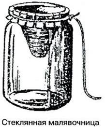 В пору осеннего жора хищных рыб трудно добыть малька для наживки. С похолоданием вся рыбья мелочь отходит от берегов, обычной малявочницей ее не возьмешь. Можно сделать ловушку наподобие рачевницы. Это проволочное кольцо диаметром 60—70 см с сеткой. В сетке на дне привязан груз, на кольце сверху три тонких медных прутика, на которые нанизываются кусочки хлебной корки. Прутики одним концом закрепляются на кольце. Тонкий прочный шнур крепится на поплавке, его длина регулируется по глубине водоема. Рыболов бросает в воду ловушку и, когда она ляжет на дно, излишек шнура наматывает на поплавок и бросает сам поплавок за борт лодки. Стеклянная малявочница для ловли мальковВ горловину стеклянной банки емкостью 1—3 л вставляют воронку из прозрачной клеенки или полиэтиленовой пленки. Угол конуса 45—60°, диаметр отверстия 30 мм. Края воронки сшивают нитками или леской. Готовый конус вставляют в банку вершиной вниз так, чтобы основание его возвышалось над горловиной банки на 30—40 мм. На основании через каждые 20 мм делают разрезы до линии соприкосновения конуса с краями банки. Получившиеся лепестки отгибают и закрепляют шнуром. Предварительно в одном лепестке прокалывают отверстие, через которое пропускают конец шнура, и только после тугой обмотки по горловине второй обмоткой закрепляют основание воронки на банке.