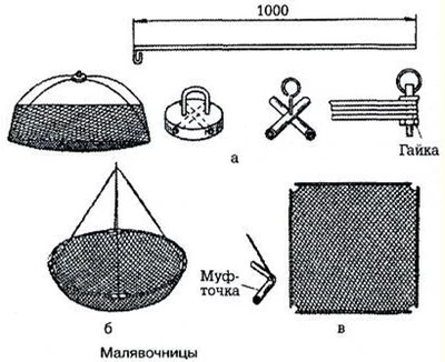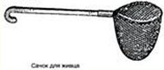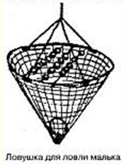 Живец, замятый руками, быстро засыпает. Поэтому его вынимают из бадейки небольшим сачком. Размеры сачка: длина ручки 380 мм, диаметр обруча 80 мм, глубина марлевой или тюлевой сетки 100 мм. Ловушка для малька