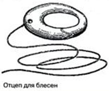 Подставка для нескольких удочек (в) может быть изготовлена из двух деревянных рамок. Откидную рамку крепят к несущей раме на петельки. Она удерживается двумя шнурами, которые можно сделать из толстой лески сечением 0,5—1 мм. Изготавливают ее из деревянных реек сечением 8 х 40 мм или из дюралюминия. Оригинальной является подставка-стойка, выполненная из колотого бамбука с металлической дужкой (г). Удобна в использовании подставка из дюралюминиевого прутка прямоугольного сечения 10 х 15 мм с дужками из отожженной проволоки диаметром 3—3,5 мм (д). Многие подставки вполне можно установить на лодке. Для этого к борту лодки прикрепляют скобу из листовой стали. Весьма устойчива конструкция подставки из желобчатой металлической стойки толщиной 1,2 мм, к которой приваривают трубчатый наконечник из стали толщиной 0,8 мм (е). Разборная металлическая подставка (ж) состоит из стойки, утолщенной внизу приваренным отрезком трубки. На стойку надевают съемную дужку. Существуют также подставки (з), которые позволяют изменять наклон удилища по отношению к линии горизонта. Они состоят из стойки и съемной планки с опорными крюками, к которым шарнирно прикреплена зубчатая рейка. Эта рейка фиксирует нужное положение опорной части. Подставки следует изготавливать из прочного и легкого материала, поэтому лучше всего использовать дюралюминий. Перевозить их в рюкзаке лучше связанными или зачехленными. На острие, которым подставка втыкается в грунт, следует надевать пластмассовые колпачки. Деревянные стойки, вырезанные на берегу, можно оставить на месте ловли — могут пригодиться на следующей рыбалке, если, конечно, кто-то ими не воспользуется. Для подставок в виде рогулек берут сухие ветви — следует беречь зелень на берегу. ЗажимПри ловле леща на донки многие рыболовы для того, чтобы удобнее было нанизывать на крючок насадку, пользуются зажимом, который делается из обыкновенной бельевой прищепки. Зажим состоит из двух палочек и пружинки. Пользуются им так: сжимают зажим за концы и вставляют крючок в зажим местом, где он привязан к леске. Затем нанизывают на крючок насадку до самого жала крючка, сдавливают зажим и освобождают крючок. ОтцепОтцеп часто спасает снасть при неизбежных задеваниях за подводные предметы, особенно за коряжник. Леска пропускается через привязанный на шнуре отцеп, который своей тяжестью освобождает крючок. Терпеливо поднимая и опуская шнур с разных сторон, можно отцепить крючок при большинстве задеваний, почти устранив потери снасти. Отцеп может одновременно служить и глубомером.