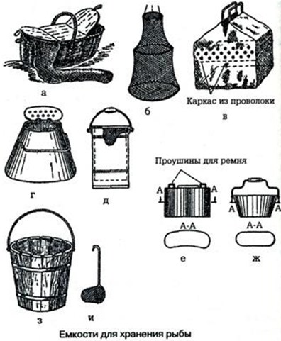 В банку (малявочницу) кладут привлекающий мальков корм — хлеб, мотыля, кашу, опарыша — и, заполнив ее до половины водой, опускают на шнуре на дно на мелком месте у берега, где плавают мальки. Свободный конец шнура привязывают к ветке дерева, склоненного над водой или к вершинке тонкого прута, воткнутого в берег. На дне малявочница должна лежать на боку. Садок для рыбыВ условиях сухого жаркого климата, когда рыбу при сорокоградусной жаре приходится сохранять в течение продолжительного летнего дня, хороший садок приобретает исключительно важное значение. Практичным, дешевым и удобным для переноски садком является мешок из редкой мешочной ткани. Преимущество мешка перед сеткой состоит в том, что при переходах он не высыхает и предохраняет от высыхания рыбу. Сделанный на затягивающемся шнурке, садок опускают на самое дно. Редкая ткань обеспечивает приток свежей воды. В таком садке при условии частых переходов с места на место удается сохранить пойманную рыбу живой в течение суток. Емкости для хранения рыбыМногие рыболовы для сохранения улова в летних условиях пользуются плетеной корзиной с откидной крышкой, погруженной в воду.