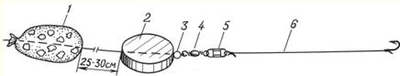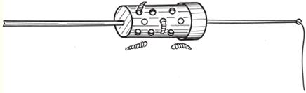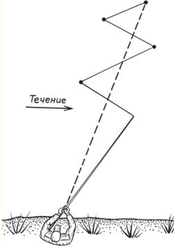 Рис. 4. Проводка елочкой На кивок окуня можно ловить достаточно успешно, особенно после того, как взойдут молодые водоросли. В это время в них стаи полосатых хищников начинают кормиться икрой и проклюнувшимися мальками. С прогревом воды в водорослях появляется множество мелких организмов, которые также привлекают окуня. Со второй половины мая окуня можно часто встретить возле молодой береговой осоки, в корнях которой живут пиявки, бокоплавы и личинки стрекозы. Эти организмы очень привлекательны для окуня, поэтому и ловля на них бывает весьма успешной, главное, чтобы мормышка не была велика по сравнению с насадкой. Проводку делают от самого дна, с частыми ровными колебаниями поднимая приманку на 40–50 см от дна. Иногда полезно мормышкой поерзать на грунте, создав небольшое облачко мути. ПескарьС просветлением воды эта рыба начинает активно кормиться возле берегов, как в притоках, впадающих в пруды, так и в самих прудах на песчаном или песчано-гравийном дне. Часто пескарь попадается в районе пляжей при ловле на удочку другой рыбы. Спустя неделю после нереста пескарь начинает хорошо клевать в устьях впадающих в водоемы притоков, в районе водосливов и водосбросов на самую простую поплавочную удочку, оборудованную легчайшей оснасткой. Поплавок следует брать с тестом до 1,5 г, основную леску – диаметром 0,1 мм, поводок – диаметром 0,08 мм, а крючок – № 15–18. Весной пескарь обычно клюет с жадностью, и замечено, что он хорошо берет после первых дождей на кусочек червя, пучок мотыля, а к концу мая и на некоторые растительные насадки, в частности на катыш белого хлеба. Ловят обычно способом быстрой или медленной проводки, пуская насадку возле самого дна или волоча ее по дну. Хорошо ловить пескаря вблизи дамбы, где есть заметная тяга течения, а также на каменисто-песчаном дне ниже плотины. Так на Царицынских прудах много пескаря попадается в районе водосброса плотины Верхнего и Нижнего пруда. При этом стайки пескаря для своего обитания часто выбирают углубления на дне в виде ямок и канав в стороне от сильной струи или ниже основного потока, где быстрое течение переходит в медленное. Во второй половине мая успешно можно ловить пескаря в мелких притоках. Для этого рыболов заходит в забродном комбинезоне или высоких сапогах в воду, становясь выше места обитания пескаря, и поднимает муть со дна. Пескарь обычно быстро собирается на быстрый поток, поэтому ловят его короткой удочкой способом короткой проводки насадки. Такая ловля бывает увлекательной. КарпЭта рыба довольно теплолюбивая, поэтому в прудах она начинает проявлять кормовую активность во второй половине мая, когда вода становится достаточно теплой. Карп обычно нерестится в начале июня, и незадолго до нереста он начинает регулярно посещать известные ему кормовые зоны пруда. А это могут быть илистые бровки с залежами мотыля, прибрежные обрывы с выходом водяных личинок. Часто место кормежки карпа можно обнаружить по пузырям, всплывающим на поверхность. Это может означать, что карп роется в иле в поисках корма. С быстрым прогревом воды сильно активизируется жизнь кормовых организмов на мелководье. Различные мелкие рачки, нимфы, червячки, пробуждаясь, появляются из-под камней, из корневищ растений, из ила. Зная места скопления живого корма, карп бывает частым гостем в мелководном коряжник
