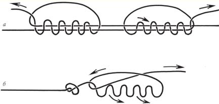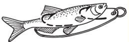 Рис. 3. Окуневая блесна с двумя крючками для подсадки малька На мелкие твистеры и виброхвосты можно с успехом ловить окуня на бровках придамбовой ямы и затопленного русла. Для этого используют джиг-головки классического образца или с офсетным крючком, который задает дополнительную подвижность приманке. Для мелких приманок подойдут джиг-головки весом 2, 3, 4 и 5 г. Джиг-приманки могут быть зелеными, желтыми, белыми, красными, перламутровыми, а также иметь комбинированную окраску. Если весна теплая, окунь вскоре выходит кормиться к прошлогоднему камышу, береговому кустарнику на относительно неглубокие места. Здесь его можно успешно ловить как маховой, так и кивковой удочкой на червя, мотыля и на «бутерброд» из опарыша с мотылем. Возле водосбросов ловят окуня впроводку, пуская насадку вблизи дна. В местах нагула со спокойной водой нередко используют принудительную проводку, осуществляя подтаскивание елочкой (рис. 4).