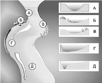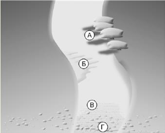 Рис. 4. Воронки и прибрежные отмели: А– мыс, вдающийся в русло подводных гряд; Б– воронки; В – глубины у берега; Г– прибрежная отмель На грани прямого и обратного течений образуются суводи (воронки). Корм, а следовательно, и рыба задерживаются на границе двух течений (рис. 4, б). Здесь можно встретить голавля, язя, щуку, а также другую рыбу. Глубины, расположенные у самого берега, можно считать очень удобными для рыболова участками, так как там также можно встретиться с любой рыбой (рис. 4, в). Прибрежные отмели с резким свалом в глубину (рис. 4, г) – излюбленные места стоянки щук и судаков, которые подкрадываются из глубины на отмель за мальком, а прибрежные глубины часто служат местом локализации и прохода практически всех рыб. Береговые овраги (рис. 5, а), сбрасывая в реку после дождя продукты размыва, образуют вдающиеся в русло отмели. Если в этом месте присутствует течение и имеется глубокое русло, лучшего места для ловли жереха и судака найти трудно.