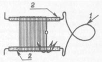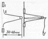 Рис. 18. 1. Кембрик. 2. Кронштейн Напряжение сниметсяЭто мотовильце сжимается под натяжением высыхающей лесы. Изготовляется оно из упругой стальной проволоки диаметром 1,2 мм или из велосипедной спицы. Резиновые трубочки предохраняют крючки от затупления (рис. 19).