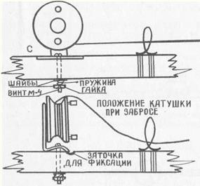 Рис. 9. 1. Пенопластовый поплавок. 2. Поводок. 3. Дополнительный поводок. 4. Карабин. 5. Грузило Поплавок (в зависимости от силы течения и глубины водоема) находится у самого дна или вполводы, поэтому, чтобы он не настораживал рыбу, его окрашивают в черный или темно-серый цвет. Если грузило падает на дно, не достигнув ограничителя на леске, излишек распущенной лески выбирают. Ловля этой снастью особенно интересна с лодки или плота на быстрых реках, ниже плотин, вблизи широких перекатов, где обычно держится крупная хищная рыба. Хотя бы одноСейчас все больше рыболовов пользуется бегучей оснасткой, которая при вываживании крупной рыбы позволяет предохранить леску от обрыва, а удилище — от поломки. Но многие продолжают ловить глухой снастью без катушки и пропускных колец. Во время вываживания такое удилище подвергается большим нагрузкам, его верхнее колено может быть сломано. Если даже установить одни пропускные кольца без катушки, то и это принесет успех. Когда удилище начнет изгибаться, усилия будут распределяться по кольцам, и наибольшую нагрузку примут комель и смежное с ним колено, то есть так же, как и при бегучей оснастке. Следует использовать маленькие кольца одного диаметра. Для трехколенного поплавочного удилища нормальной жесткости достаточно трех колец, устанавливаемых от вершины на расстояниях, равных 15, 35 и 65 процентам общей длины удилища. Но пропускные кольца полностью не предохраняют от обрыва лески. Поэтому рыболов должен полнее использовать упругие свойства удилища. Если оно хорошего строя, то при угле между натянутой леской и удилищем в 90 —110° можно вытащить крупную рыбу и сохранить снасть. Нельзя допускать, чтобы угол был острым. Тогда и при пропускных кольцах верхнее колено может обломиться. Затянутый в воде прочнееЯпонская леска легко рвется на узлах. Чтобы этого не случилось, делают так. Готовят узел и затем, опустив его в холодную воду, затягивают пинцетом или руками. Затянутый в воде узел становится намного прочнее. С обычной… без инерцииОбыкновенную проводочную катушку с помощью поворотного кронштейна можно использовать как безынерционную. При забросе катушка закрепляется поперек удилища, а после того как приманка достигнет заданной точки, ее опять поворачивают — ставят в обычное положение. Вместо поворотного кронштейна можно воспользоваться простым приспособлением, изображенным на рис. 10.