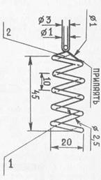 Рис. 3. 1. Место пайки. 2. Пружина. 3. Ось Основание кольца изготавливают из металлической нержавеющей пластины, или на него нужно нанести антикоррозийное покрытие. Форма и размеры основания кольца указаны на рис. 4. Ширина — 8 мм, толщина — 5 мм. Концы пропускного кольца вводятся в отверстие основания диаметром 3 мм и припаиваются.