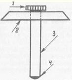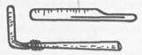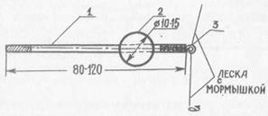 Рис.13. В один конец стержня с помощью водостойкого клея «впаивается» кольцо из тонкой проволоки (3). Другой конец наглухо запаивается тем же клеем. Более совершенные способы крепления поплавка к леске (двумя кольцами и др.) утяжеляют конструкцию и уменьшают чувствительность поплавка. Передвигая шарик по стержню, добиваются, чтобы поплавок с леской и мормышкой лежал горизонтально на поверхности воды (при использовании мормышки среднего веса часть стержня со стороны кольца должна составлять 0,2–0,25 от общей его длины). При поклевке длинная часть стержня поднимается (поплавок встает вертикально). Если же рыба, взяв мормышку с насадкой, движется не вглубь, а в сторону, то поплавок быстро разворачивается в направлении ее движения, сигнализируя о поклевке. Боковой кивокПростой по конструкции, но достаточно чувствительный боковой кивок для ловли длинным удилищем в отвес получится из медной проволоки (диаметром 1 мм, длина 30 мм) и семисантиметрового отрезка ниппельной резины.
