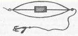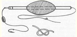 Рис. 8. 1. Шайба. 2. Пластинка. 3. Стержень. 4. Кольцо Указанный якорь легко поднимать, это важно для рыболова с резиновой лодкой. Эпоксидная «рубашка»Пенопласт широко применяется рыболовами. Из него делают поплавки, удильники, мотыльницы и другое. Недостаток материала — пористость, малая прочность. Устранить этот изъян легко, покрыв поверхность изделия эпоксидным клеем. Его можно купить в магазине, а способ приготовления указан на упаковке. Клей при помощи деревянной лопаточки наносят на чистую и сухую поверхность и разравнивают. Когда он высохнет, на пенопласте образуется корка. Чем прочнее она должна быть, тем больше слоев клея необходимо. Каждый из них следует сушить не менее шести часов, а верхний — до суток. Затвердевший слой зачищают наждачной шкуркой, а при помощи пасты ГОИ его можно отполировать до блеска. Эпоксидное покрытие можно сделать цветным. Для этого в клей добавьте краситель, например, масляную краску, что продается в тюбиках. Больше добавите краски — гуще станет цвет. Пригодится и этоЛюбителям мастерить своими руками садки для живцов, сачки, прикормочницы и другие рыбацкие принадлежности стоит обратить внимание на сетчатые мешочки из-под овощей и фруктов, которые обычно выбрасываются. Их не надо сшивать при образовании конусной или цилиндрической поверхности, а ширина такова, что можно натянуть на металлическое кольцо диаметром 250 мм. Используя напор струиДля ловли рыбы на быстринах рек можно успешно использовать донные удочки, устанавливая их в рабочее положение при помощи напора водной струи. Крупный пенопластовый поплавок (самопогружающийся в воде наполовину) соединяют с поводком длиной 1.5 м и диаметром 0,40—0,45 мм. Поводок оснащают двумя съемными поводочками, на концах которых крепятся одинарные или двойные крючки № 7—10. В гипсовых формочках отливают 100–120 граммовые свинцовые грузила в виде конуса. К телу грузил припаивают по два колечка диаметром 2 мм для пропуска основной лески, которая соединяется с поводком через вертлюжок. Груз должен свободно перемещаться по леске, но не проходить через вертлюжок-ограничитель на поводок (рис. 9). Техника ловли проста. Держа грузило в руке, поплавок с поводком опускают в воду. Сильное течение, унося снасть, разматывает леску с катушки или мотовильца. Когда поплавок удалится на требуемое расстояние, фиксируют леску и дают ей возможность как можно сильнее натянуться. Затем поднимают леску с грузилом на вытянутой руке вверх и отпускают груз (желательно, чтобы угол между леской и уровнем воды был наибольшим). Груз но вытянутой леске «догоняет» ушедшую снасть и, остановившись у ограничителя, плавно опускается на дно водоема.