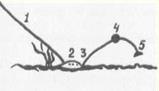 Рис. 1. 1. Леска. 2. Скользящее грузило. 3. Дробинка-ограничитель. 4. Поплавок. 5 Крючок с приманкой Кольца-самоделкиБезынерционная катушка требует установки на удилище колец большого диаметра. И если их нет в продаже — можно попытаться сделать в домашних условиях. Делают кольца из рояльной проволоки диаметром 2 мм. Применяют для этой цели и велосипедные спицы, которые продаются в спортивных магазинах. Обмотку крепления можно выполнить белыми капроновыми нитками, а после покрыть цветным нитролаком. Когда лак засохнет, покрывают еще два раза тонким слоем масляного лака. Будет прочно и красиво (рис. 2).