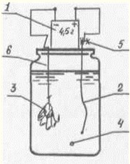 Рис. 7. С помощью батареи (1) напряжением 4,5 вольта от карманного фонаря (например 3336Л по ГОСТ 2583 — 79 емкостью 2,5 ампер-часа) производится электрохимическое осаждение серебра толщиной до 0,1 мкм. Анодом (2) служит чайная ложка из нержавеющей стали. Отношение площадей анода и катода (3) (крючков) 4:1. При обработке крючков № 7–9 (площадь 0,01 дм2) их количество составит 25 шт. Если это тройники, то 8 штук. При этом время процесса до истощения батареи 20 часов. Необходимая температура раствора 20–22 °C поддерживается постоянной, если литровую банку (4) держать на батарее водяного отопления. Крючки подвешивают на проволоке (6) диаметром 0,5 мм. В ложке просверливают отверстие диаметром 3,5 мм для подключения проводника с помощью винта мЗх10 (5) (от неисправного электропатрона). С помощью данного процесса, доступного в домашних условиях, возможно серебрение и других деталей рыболовной оснастки. Блесна серебряная…Надежно серебрит блесну оловянная амальгама. Состав должен состоять из 65 весовых частей олова и 35 — ртути. Последняя подойдет из разбившегося медицинского градусника. Помните — пары ртути ядовиты, оберегайте от них дыхание. Процесс заключается в следующем. В расплавленное олово (сосуд из алюминия, меди и других цветных металлов непригоден), не снимая с огня, вливают ртуть и быстро перемешивают деревянной лопаткой, только не смолистой. Получившуюся массу остужают, сушат, дробят и, наконец, растирают в фарфоровой либо металлической чашке в порошок. Затем смешивают с 26–27 весовыми частями талька и 5–8 — какой-нибудь кристаллической, тоже тщательно растертой, кислоты, например лимонной, щавелевой, винной. Состав наносят на поверхность медной, латунной или бронзовой блесны и растирают, после чего хорошо промывают. Если в составе отсутствует кислота, то блесну, прежде чем натирать, смазывают соком кислой травы или ягоды (щавеля, клюквы и т. д.). Состав не обладает едким свойством, не разлагается на свету. Вместо олова можно воспользоваться третником или свинцом, но тогда блесна не будет такой светлой. …И двухцветнаяДвухцветные блесны делают так. Блесну полируют, а затем одну из сторон, подлежащую серебрению, обезжиривают и натирают зубным порошком. Подготовленную блесну опускают на 5–6 часов в отработанный фиксаж. Обезжиренная сторона блесны становится серебряной, а вторая — золотистой, если это красная медь, либо желтой, если латунь. Легкий якорьДля его изготовления потребуется металлическая пластинка толщиной 4–5 мм, шириной 30 мм, длиной 100 мм. Концы пластины делают острыми, в центре ее просверливают отверстие диаметром 9 мм. На конце стержня нарезают резьбу, с противоположной стороны приваривают кольцо для шнура (рис. 8).