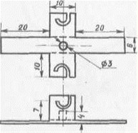 Рис. 2. 1. «Гнездо». 2. Кольцо. 3. Лапки. 4. Клинья. 5. Фольга. 6. «Гнездо» Кольца можно примотать также швейным цветным шелком, который бывает в продаже на картонных шпульках. Для обмотки надо использовать более толстую нить (свить три нитки) и после покрыть масляным лаком 2–3 раза. На удилище длиной 1,65 м достаточно иметь три кольца, включая «тюльпан». Первое кольцо можно поставить на расстоянии 40 см от торца шпульки катушки, второе — в 56 см от первого и на конце — «тюльпан». Более удобными при транспортировке будут съемные кольца. Для этой цели используются такие же кольца, а вместо постоянной обмотки крепления на удилище устраивают «гнезда» для вставки в них лапок колец. Из бамбука приклеивают к удилищу клинышки (4 шт. на каждое кольцо), сверху накладывают фольгу или тонкую медную пластинку. Дальше гнездо приматывается нитками. Образовавшуюся обмотку дважды покрывают масляным лаком. Чтобы установить на место кольцо, лапки его сжимают, вставляют в гнезда и отпускают. В силу упругости они держатся достаточно надежно. При транспортировке съемные кольца перевозятся отдельно от удилища. Нетрудно изготовить и стационарные складывающиеся кольца. Из оцинкованной жести толщиной 0,7–0,8 мм вырезать крепление (рис. 3) и боковые щечки согнуть по пунктирным линиям до вертикального положения.