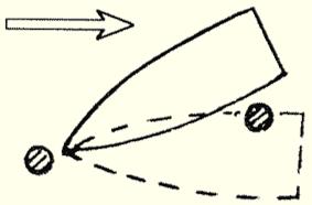 Рис. 3. Постановка лодки на якоря После постановки на якоря можно забросить первую порцию прикормки и приступить к подготовке «рабочего места» и снастей. Все предметы и принадлежности нужно расположить таким образом, чтобы они находились под рукой, но не загромождали днище лодки, так как за них можно зацепиться и потерять равновесие. Подсачек с относительно короткой рукояткой кладут у левого борта сеткой к носу лодки, а снасти — с правой стороны. Надо подготовить и садок, но по старой рыбацкой примете не опускать его в воду до поимки первой рыбы. Через 10–15 минут после заброса прикормки можно приступить к ловле. С лодки ловят поплавочной удочкой (в отвес или в проводку), снастью для дальнего заброса, «спидонками» и т. д. Во всех случаях забрасывать приманку лучше сидя, а если появится необходимость делать это стоя, надо занять устойчивое положение, слегка расставив ноги. И вообще, передвигаться по лодке нужно осторожно, держась руками за борта, и не суетиться. После подсечки рыбу вываживают по воде и, если она невелика, подхватив леску рукой, перебрасывают через борт, а крупную берут в подсачек с левой стороны (удилище — в правой руке, рукоятка подсачека — в левой), и лучше это делать сидя на банке (сидении) лодки, не перевешиваясь за борт. Пробки с «телескопов» надо класть в определенное место, например в карман куртки или рюкзака. Если в процессе ловли потребуется укоротить удилище, снимать комлевый наконечник и выдвигать звенья нужно предельно осторожно, чтобы они не упали в воду. Прикармливают рыбу обычно шарами из глины с замешанным в нее кормом, но лучшие результаты дает прикормка (пищевые отходы хлеба, каши и т. п.), опущенная в воду с кормы в мелкоячеистой сетке. В прикормленном месте крутится разная рыба, и удильщик даже с примитивной поплавочной удочкой редко оказывается «в пролове», т. е. без рыбы. При ловле с дальним забросом или бортовыми «спидонками» на закрытых водоемах сетку с кормом и небольшим грузом забрасывают на несколько метров от лодки и помечают ее положение крупным поплавком из пенопласта. Ужение в проводку с лодки, как правило, более эффективно, удобно и менее утомительно, чем при ловле с берега. Отпадает необходимость в непрерывных забросах: опускают за борт по течению приманку и дают ей проплыть на всю длину распущенной лески, управляя движением приманки с помощью удилища, лески и поплавка. Если поклевок нет, поплавок и приманку подтягивают к лодке, а затем пускают в новый проплыв. Прикормку в виде шаров можно опустить бесшумно, положив их на лопасть весла. Хорошие результаты на течении дает прикормка в сетке за счет более быстрого размывания корма, чем в стоячей воде. Снасти с катушками и пропускными кольцами применяются при ловле на большой глубине (4–5 м), на сильном течении и при необходимости дальнего отпуска приманки. Можно пользоваться и удочками только с пропускными кольцами (без катушек), разместив запас лески на укрепленное на комле удилища мотовильце и разматывая леску пальцами левой руки. Представляет интерес поиск с лодки стаи рыб с использованием особи того же вида. Этот способ, получивший название «к стае за проводником», не новый, но малоизвестный. Как-то один старый рыбак поделился с М. А. Шолоховым секретами выхода на стаю стерлядей. У стерляди-живца прокалывают хвост, продевают и завязывают 