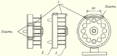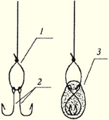 Рис. 1. Два крючка на поводке: 1 — петелька; 2 — крючки; 3 — насадка Высокоспортивным и увлекательным является ужение в проводку, для которого нужно хотя бы слабое течение. Ловят в проводку (с берега, лодки, плотов и т. п.) многих рыб, в том числе язя, леща, голавля, подуста, усача, густеру, плотву, окуня. Глубины выбирают от 1,5 до 6 м, не меняющиеся на протяжении хотя бы 6–8 м по течению, при незахламленном и относительно ровном дне. Обязательным условиям успешной проводки является прикормка. Для ловли в проводку выбирают удилище длиной 2,5–5 м, с катушкой и без нее, а леску устанавливают той же длины или на 0,5–1 м больше. Необходимый спуск регулируют по движению поплавка: если оно с задержками, спуск увеличивают. Проплыв приманки обычно разнообразят с помощью удилища и натянутой лески. Так, осуществляют подтормаживание, отпуск приманки, волочение ее по дну и т. д. В конце проплыва делают короткую подсечку, так как рыба часто хватает приманку в момент ее отрыва от дна, и выполняют новый заброс. Универсальными приманками для ужения в проводку являются: весной — кисточка мотыля и навозный червь, а затем личинки ручейника и короеда, с появлением мясных мух — опарыш; летом — растительные насадки (манное тесто, горох, перловка) и прядки зелени; осенью — снова приманки животного происхождения. Большие возможности открываются перед ловлей в проводку с лодки, но об этом несколько позже. Сейчас же мы остановимся на приемах пользования поплавочной снастью с дальним забросом и «бегучей» оснасткой, которая может применяться для ловли как на закрытых водоемах, так и на течении. После приведения снасти в рабочее положение прежде всего необходимо установить требуемый для данных условий спуск. Под спуском в снастях со скользящим поплавком, к которым относится и снасть с дальним забросом, следует понимать расстояние от крючка с приманкой до верхнего стопора. Вначале верхним стопором устанавливают небольшую глубину погружения приманки, и из воды будет выступать только вершина антенны. Таким спуском пользуются при ловле «вполводы», что иногда приходится делать. Перемещают стопор вверх и производят повторный заброс — поплавок ложится на воду, т. е. «выкладывается». Это значит, что спуск слишком большой, крючок с приманкой и оба грузила (основное и «подпасок») лежат на дне водоема. Уменьшают спуск, выполняют еще один заброс: теперь из воды выходит вся антенна и даже верхушка тела поплавка — на дне находятся крючок с приманкой и «подпасок». Такое положение должен принять поплавок при поклевке, но для правильной «исходной позиции» спуск оказался все таки большим. Опускают немного стопор и после заброса получают то, что нужно: поплавок погрузился приблизительно до двух третей антенны — на дне лежит только крючок с приманкой, «подпасок» при этом может касаться дна. При некотором навыке для выполнения этой операции может и не потребоваться четырех пробных забросов, тем более если рыболов располагает предварительной информацией о глубине водоема. Вообще не рекомендуется лишний раз перемещать стопор, небольшие поправки в положение поплавка можно внести варьируя дальностью заброса. Теперь о самом забросе приманки в снасти с бегучей оснасткой. Вначале выключают стопор обратного хода БК и устанавливают в нужное положение регулятор тормоза. Затем удилище в ме