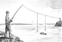 Рис. 2. Ловля перетягой В случае поклевки крупного голавля его вытягивает тот рыболов, чей берег и место для выводки лучше, или тот, который имеет сачок или багорик. В случае обрыва шнура у одного из спиннингов выводку рыбы продолжает второй. Намереваясь ловить на перетягу, один из рыболовов заранее переправляется на другой берег реки и в условленном месте, в наиболее узком участке реки, перекидывает с грузом конец своего шнура на другой берег. Если река слишком широка и спиннингист не в состоянии перебросить груз на другой берег, то второй спиннингист прицепляет к своему шнуру грузило-кошку и забрасывает его так, чтобы перекрыть шнур своего партнера выше грузила. Затем он дает своему грузилу затонуть и тянет его на себя, подтягивая этим самым и шнур, идущий с противоположного берега. При ловле перетягой необходимо, чтобы длина шнура каждого из спиннингов могла с запасом перекрывать ширину выбранного для ловли водоема. Иначе может получиться, что в широком месте из-за недостаточной длины шнура рыбу нельзя будет подвести к берегу. Если все-таки такая неприятность произошла, тот рыболов, что стравливает шнур, должен зайти в воду на мелководье, а на крутом берегу — обрезать шнур у самой катушки. На относительно узких реках можно ловить «тюкалкой» в одиночку — в этом случае напарника заменяет амортизатор из тонкого авиамодельного шнура, закрепленный на противоположном берегу. Чтобы не стоять без поклевок на одном месте, ожидая, когда же вернется стайка голавлей, спугнутая плеском пойманной рыбы, удобней всего (если ловля происходит в малонаселенной местности) накануне рыбалки укрепить в разных местах несколько резинок к деревьям или к специально вбитым колышкам, пристегнув к другому концу карабинчиком кусок старой лески, тянущийся на противоположный берег, с которого будет производится ловля. Придя на новое место, достаточно выбрать леску и пристегнуть амортизатор к оснастке удочки или спиннинга.