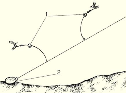 Карась. Одна из самых популярных и широко распространенных рыб. Декоративные формы карася известны как золотые рыбки. За время селекции карася выведены десятки пород, отличающихся формой тела, плавников и окраской. Для рыболовства интересны два основных вида карася: золотой и серебряный. Золотой карась. Тело высокое с толстой спиной, умеренно сжатое с боков. Чешуя медно-красная с золотым отливом, крупная, гладкая на ощупь. Плавники красноватые, брюшко светлое, спина несколько темнее. Достигает длины 40–45 см (обычно 20–25 см), массы 3–5 кг (обычно 500–900 г). В озерах Зауралья встречаются экземпляры массой до 6 кг. В малокормных водоемах тундры есть карликовые формы карася длиной не более 15 см и массой от 80 до 100 г. Нерест порционный при температуре воды не ниже 14°С. Плодовитость до 400 тыс. икринок. При пересыхании водоема может глубоко зарываться в ил и там пережидать неблагоприятные условия. Подобным образом ведет себя и при промерзании водоема. Широко распространен на территории России вплоть до Лены. Предпочитает водоемы с илистым дном, ямы и другие неровности дна, закоряженные места с зарослями водной растительности. В жаркие дни поднимается к поверхности воды. Серебряный карась отличается от золотого менее высоким телом, шершавой чешуей. Окраска тела серебристая, иногда с небольшим золотым отливом, спина и брюшина темнее, а плавники имеют желтоватый цвет. Достигает длины 40 см, массы до 4 кг. Нерестится в зависимости от региона, погоды и других условий в мае – июне. В некоторых местах – в июле. Ареал обитания – от западных границ России до Дальнего Востока, включая Сахалин и некоторые районы Заполярья. Акклиматизирован на Камчатке. Ловят карася в основном поплавочными и донными удочками. Успешнее всего – через несколько дней после нереста, но это зависит от погоды и выбора места. Иногда в хорошо прогреваемых мелких водоемах карась начинает брать уже в мае, а в августе клев может прекратиться. В некоторых водоемах карась активно берет до сентября. Ловить карася можно с берега и с лодки, расчищая пространство среди водной растительности. Лучшее время лова – утреннее (8–10 часов) и вечером на закате. Иногда в сильную жару карась берет и в полдень, но самого крупного карася лучше всего ловить поздно вечером или ночью, когда он нередко кормится поверху. Из снастей лучше воспользоваться углепластиковым удилищем с легким и чувствительным поплавком, маленьким грузилом (одним или несколькими), тонким поводком и крючком № 3,5–8 в зависимости от размера предполагаемой рыбы. Очень эффективна ловля на летнюю удочку с боковым кивком и мормышкой. При этом удилище должно быть оборудовано пропускными кольцами, тонкой леской и фрикционным тормозом, позволяющим амортизировать рывки сильной рыбы. Мормышку опускают ближе к водной растительности или в окнах между корягами и водорослями (в этом случае ставят более толстую леску, поскольку рыбе нельзя давать хода во избежание зацепа). Ловят карася на донные удочки с кормушками или без таковых, на донку с резиновым амортизатором. При ловле на сильно заиленном дне применяют всплывающую оснастку (рис.). Рис. Оснастка для ловли на сильно заиленном дне: 1 – пробковые или пенопластовые шаровидные поплавки диаметром 0,5–0,7 мм; 2 – плоское грузило Карась ленив, передвигается мало, поэтому ловить его следует, пред