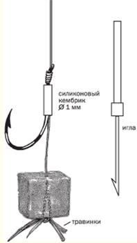 Рис. 4. Насаживание мягких растительных приманок с помощью специальной иглы