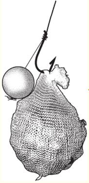 Рис. 6. Прикормка (бойлы) в растворимой сетке При ловле с волосяной оснасткой рыболовы иногда доставляют на дно бойлы в качестве прикормки с помощью сетки из растворимой ткани (рис. 6). В этом случае после заброса сетка растворяется в воде, и бойл на волосе располагается непосредственно среди прикормки, что менее всего настораживает карпа. (В.А. Казанцев) | |