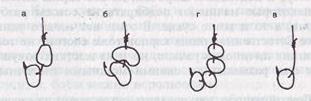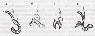 Рис. 6 Живые насадки и «бутерброды»: (а) выползок, (б) кусок червя с двумя кукурузными зернами, (в) опарыш с перловкой, (г) опарыш с червем. Один-два навозных или красных дождевых червя также годятся для активной ловли, но еще лучше подлистники и черви, живущие во мху. Что касается подсечки, то нужный момент опытные карпятники при ловле на червя определяют интуитивно, поэтому какие-либо рекомендации давать трудно. С одной стороны, карп заглатывает червя медленнее, чем, например, хлебную корку, которая втягивается им в рот молниеносно. С другой — тянуть с подсечкой опасно, потому что карп может выплюнуть. На первый взгляд ловля на червя кажется очень простой, даже самой простой, детской. Но для эффективного использования червя требуется мастерство. И именно подсечка позволяет отличить мастера от остальной массы рыболовов. Весной, а также после продолжительных дождей, когда черви в большом количестве попадают в воду, они вполне годятся и для обычной ловли со дна. Но в большинстве водоемов лещ, окунь, ерш, угорь и другие любители червей делают их применение весьма проблематичным. Наибольших успехов мы добивались, комбинируя на крючке NN 2–4 короткого, толстого червя или половину выползка с несколькими кукурузными зернами (рис. 6б). Опарыш и другие личинкиВозможности опарыша, как карповой насадки, ограничены в первую очередь тем, что другая рыба берет его не менее охотно, чем карп. Нескольких опарышей на крючке в состоянии заглотать даже мелкая плотва. Но не зря же существует закон перехода количества в качество: качественно новая насадка, которая не по зубам не только плотве, но и лещу, получится, если увеличить количество опарышей до 50–80 штук. С помощью швейной иглы их можно нанизать на нитку, а затем обмотать эту нитку вокруг крючка N 1. Благодаря очень удобному свойству опарыша никогда не слетать с крючка, его иногда употребляют в качестве стопора для удержания на крючке таких насадок, как черви и мягкая кукуруза. В этих случаях личинки насаживаются на крючок в последнюю очередь (рис. 6в). Двух-трех опарышей на небольшом крючке можно предложить карпу в качестве свободно тонущей насадки. То же самое относится к «бутербродам»: опарыши с навозным червем и опарыш с пшеничным зерном. Последнее сочетание особенно удачно; быть может, зерно с шевелящимся «хвостом» напоминает рыбе маленькую улитку или еще что-нибудь в этом роде (рис. 6г). Гораздо лучшей, хотя и менее доступной насадкой для активной ловли являются личинки пчел (трутней) и ос. «Личинка осы крупнее и нежнее опарыша, очень уловистая наживка, но добыть ее нелегко — осы добровольно свое потомство не отдают. Лучше всего провести операцию по захвату личинок поздно вечером, когда насекомые уже устроятся на ночлег». — Упаси вас Бог от таких легкомысленных советов. Уничтожение осиных гнезд должно производиться (в случае необходимости) специалистами, в защитной одежде, и не в коем случае не на авось. Дилетантские действия по «захвату» желанной насадки, даже поздно вечером, могут закончиться для «нападающего» смертельным исходом, и тому есть немало печальных примеров. Личинок пчел (трутней) можно получить, установив контакт с пчеловодом. Если соты оказываются запечатанными, их вскрывают иголкой. Годятся и почти готовые трутни, которых насаживают за голову; они превосходно держатся на крючке. С