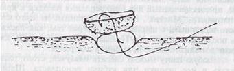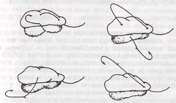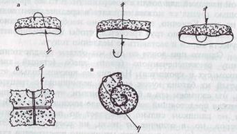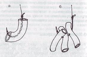 Рис. 2 Комбинация из корки и пасты на илистом дне У большинства рыболовов приготовление паст ассоциируется с запачканными, клейкими руками, не менее запачканными кухонным столом и посудой, неизбежными нареканиями со стороны хозяйки. Избежать этих маленьких неприятностей помогает простой пластиковый пакет. Вылейте, высыпьте или положите в пакет ингредиенты, завяжите его — и разминайте пасту, сколько душе угодно. И, наконец, немного о хранении паст. В принципе желательно готовить пасту в таком количестве, которое может быть использовано за одну рыбалку. Но если завернуть пасту в алюминиевую фольгу и положить ее в холодильник, она может продержаться там недели две-три. Правда, от пребывания в холодильнике качество ее не улучшится. Замораживать же пасту не рекомендуется: побывав в морозильнике, она становится жесткой и начинает крошиться. Клецки и макароныЕсли мелкая рыба неустанно теребит насадки из пасты, попробуйте ловить на клецки. Для их приготовления достаточно поместить шарики пасты на короткое время в кипящую воду. Тогда они покроются упругой, клейкой оболочкой. Некоторые рыболовы обваливают клецки в панировочной муке, аргументируя это тем, что мука будет отставать в воде от клецек и дополнительно приманивать карпов. На наш взгляд, она скорее привлечет мелочь, чем карпов. Хотя нельзя не признать, что суета вокруг насадки может заинтересовать и карпов, а самим клецкам мелочь не страшна благодаря их твердой оболочке. По классическим правилам клецки насаживают с помощью специальной иглы: сначала на леску нанизывается клецка, и лишь потом привязывается крючок (см. рис. 4 — насаживание картофеля). Но такая сложная процедура не всем рыболовам по душе. Особенно нетерпеливым мы можем порекомендовать другой способ: соблюдая известную осторожность, крючок можно ввести в клецку, как в хлебную корку, не разорвав ее при этом (см. рис. 1 — насаживание хлебной корки). Всевозможные макаронные изделия, прежде всего макароны и так называемые рожки, употребляются преимущественно восточноевропейскими карпятниками. Их приходится насаживать на крупные крючки (NN 1–2) с круглым изгибом, продевая крючок в полость (рис. 3а). Впрочем, тонкие макароны можно насаживать по несколько штук, как червей (рис. 3б).