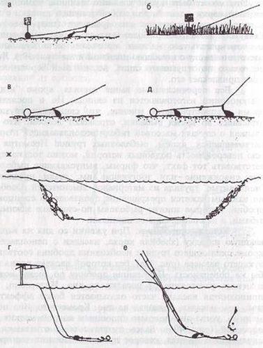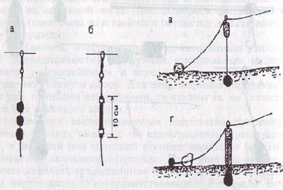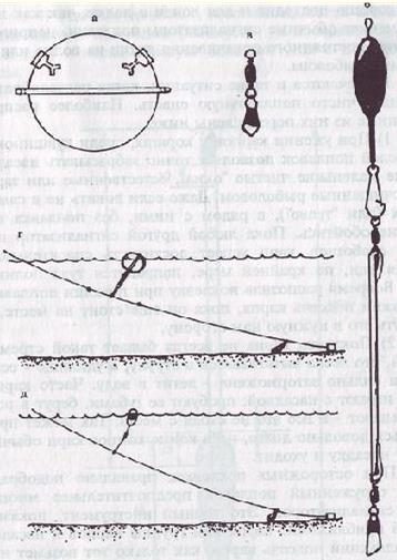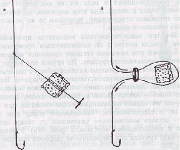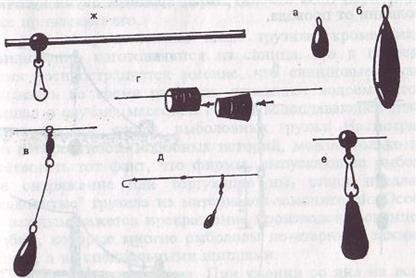Рис. 1. Грузила с использованием сахара На рисунке 1б показано комбинированное грузило, одна часть которого растворяется, а другая — отсоединяется от лески. Сахар здесь просто зажимается петлей лески, а роль стопора, удерживающего эту петлю, может играть шайба или гайка, которая после растворения сахара остается на дне. Растворимой частью грузил не обязательно должен быть сахар. Существует, например, растворимая в воде прозрачная поливинилалкогольная фольга (пленка), в которую можно завернуть немного прикормки или камешек. Завязав получившийся мешочек узкой полоской той же фольги, прикрепите его к вертлюжку с застежкой, находящемуся на основной леске. После заброса фольга растворится, а прикормка или камешек останется лежать неподалеку от крючка. Наконец, изобретательные производители рыболовных принадлежностей придумали специальные шарики-грузила, распадающиеся в воде на их составные части: прикормку, глину и песок. Для этих шариков, продающихся с уже готовыми отверстиями, пригодны те же оснастки, что и для кускового сахара. Все три вышеупомянутых недостатка простейших оснасток, правда вместе с их единственным преимуществом, в большей или меньшей степени позволяет устранить применение скользящего грузила. Из грузил мы могли бы порекомендовать традиционное каплеобразное с залитым в него вертлюжком. Усовершенствованное Ричардом Вокером на озере Эрлеси (Англия), оно получило название «Эрлеси Бомб» («Arlesey Bomb»). Выбирая форму грузила, Вокер учел не только аэродинамические свойства при забросе, но и сопротивление, оказываемое карпу при поклевке — отсюда максимально удаленный от лески центр тяжести и вращающийся вертлюжок (рис. 2а). Удлиненный вариант грузила для сверхдальних забросов показан на рисунке 2б. Грузило не обязательно ставить прямо на леску. Его можно привязать к короткому (5-15 сантиметров) поводку с вертлюжком на другом конце (рис. 2в). Пропустив леску сквозь вертлюжок, мы одеваем на нее стопор, после чего уже можно привязывать крючок. Отдавая предпочтение специальному пластмассовому стопору, состоящему из двух частей (рис. 2г), мы можем быть уверены, что, в отличие от свинцовой дробинки, он не съедет к крючку в момент заброса и не повредит леску. Но за неимением таких стопоров можно брать кусочки изоляции от провода с отверстием соответствующего диаметра и затыкать их деревянными клинышками. Если же вместо стопора использовать вертлюжок, то в оснастке появятся два лишних узла. Рис. 2. Стандартные элементы оснасток: (a) Arlesey Bomb, (б) его удлиненный вариант, (в) грузило на поводке, (г) пластмассовый стопор, (д) готовая оснастка, (е) бусинка с застежкой, (ж) бусинка на трубке Готовая оснастка показана на рисунке 2д. В последние годы вместо вертлюжка стало модным использовать специальные бусинки с застежкой (рис. 2е); эта застежка позволяет очень быстро сменить грузило. Насаженная на пластмассовую трубку (рис. 2ж), такая бусинка не дает оснастке перепутаться при сильном забросе. В принципе скользящий поводок, к которому привязывают грузило, должен быть слабее основной лески. Тогда, если грузило зацепится, не придется обрывать всю оснастку. Но в «зацепистых» местах мы рекомендуем ставить на поводок несколько крупных дробин, а не привязывать к нему грузило (рис. 3а). Дробины в крайнем случае просто соскользнут с поводка, поэтому про