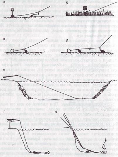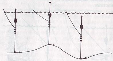 Рис. 8. Всплывающий поплавок-перышко в действии Стоит карпу втянуть насадку в рот, как поплавок всплывет и ляжет на воду (рис. 8б). Насадки здесь намеренно подбираются такие, которые позволяют подсекать немедленно, как только поплавок начнет всплывать: кукурузные зерна, пшеница, перловка, хлебные корки и т. п. Одним движением рыболов поднимает удилище с подставок и подсекает; если эти два действия не сольются в одно, то подсечки не получится. Рецепт достижения нужной быстроты реакции прост: тренировка, тренировка и еще раз тренировка. Всплывающие поплавки-перышки работают только в тихую погоду, недалеко от берега и на сравнительно небольшой глубине, что серьезно ограничивает их возможности, но ведь они, строго говоря, и рассчитаны не на карпа, а на линя, леща и крупную плотву. Широкую известность они получили после того, как братья Тэйлор в Англии применили их для уженья линя и добились удивительных успехов, о чем Фред Тэйлор увлекательно рассказал в своей книге «Тэнч» («Линь»). И только крайняя необходимость вынуждает карпятника обращаться к таким деликатным оснасткам. Рис. 9. Тяжелый скользящий всплывающий поплавок в действии Совсем другое впечатление производят тяжелые скользящие всплывающие поплавки, применяемые на больших глубинах (рис. 9). Они значительно увеличивают радиус действия поплавочной удочки, а небольшая волна и ветер им нипочем благодаря стабилизирующему действию грузила-оливки (4–5 граммов) и очень длинной бамбуковой антенне, оканчивающейся ярко-красным шариком. Оливка погружает поплавок до основания антенны. Стопор удерживает оливку примерно в метре от дробины, которая, в свою очередь, находится в нескольких сантиметрах от крючка. Насаживая хлебные корки, приходится для компенсации их плавучести добавлять еще одну, маленькую дробинку, зажимая ее на леске у самого крючка. Оливка и дробины должны полностью топить поплавок (включая шарик антенны), если спуск установлен слишком малый. Если же спуск слишком велик, то антенна выступает из воды. Это свойство поплавка мы используем для исследования рельефа дна, а также для точного заброса насадки, например на узкую подводную гряду (рис. 10).