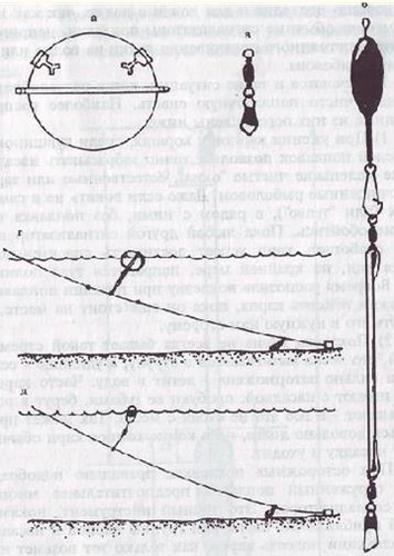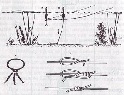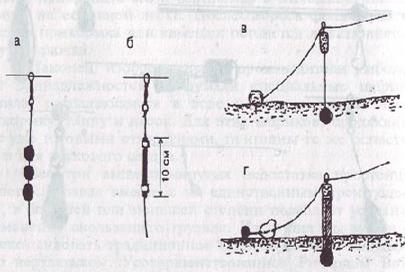 Рис. 7. Самоогружающийся поплавок Ю. Баличева в действии: (а, б) заброс, (в) силиконовые стопоры и (г) стопор из лески Что же касается верхнего стопора, ограничивающего спуск, то при его выборе имейте в виду следующее: стопор должен свободно проходить сквозь кольца удилища; он должен держаться на леске достаточно прочно, не передвигаться самопроизвольно, но и не портить леску, когда его передвигает рыболов. Мы предпочитаем силиконовые стопоры, как самые надежные. Они продаются на проволочках по пять штук в упаковке, различных размеров для лески разной толщины (рис. 7в). Несколько хуже точно такие же стопоры из каучука (латекса). Самодельный стопор можно изготовить из мягкой (в том числе плетеной) лески, используя узел, показанный на рисунке 7г. Если он будет проскакивать сквозь отверстие вертлюжка, оденьте на леску маленькую бусинку. Немаловажное преимущество нашего поплавка заключается в том, что принцип свободного скольжения в сочетании с большой массой, свойственной самоогружающемуся поплавку, позволяет перебрасывать удочку без зацепов за траву, стебли кувшинок и коряги: при быстром подматывании лески крючок и грузило сразу же поднимаются к поплавку, который в этот момент за счет своей большой инертности все еще находится в состоянии покоя (рис. 7а). Затем поплавок, грузило и крючок с насадкой движутся к рыболову по поверхности воды, не зацепляясь за подводные препятствия. Благодаря этому свойству нашего поплавка при забросе нет необходимости сразу точно попадать в цель (хотя точность забросов с этим поплавком, как уже отмечалось, достаточно высока). Чтобы наверняка избежать повторных забросов, которые создают излишнее беспокойство в месте ловли, мы обычно забрасываем несколько дальше, чем нужно, и начинаем подматывать леску, не давая крючку с насадкой опуститься вниз и зацепиться. Как только поплавок оказывается в нужном месте, мы перестаем подматывать леску и опускаем удилище. Крючок с насадкой и грузило опускаются на дно (рис. 7б). Данный поплавок весьма чувствителен за счет того, что центр тяжести расположен в нижней его части. Верхняя же часть, особенно антенна, чрезвычайно легка. Брошенный в воду без лески, поплавок долго покачивается из стороны в сторону, напоминая «ваньку-встаньку». Легкая толстая антенна, выступающая из воды сантиметров на десять, хорошо заметна даже на рассвете и в сумерках. Во время ловли с таким поплавком насадка, как правило, лежит на дне — вместе со всем грузом. Единственное назначение груза — удерживать насадку на месте при ветре и волнении, самому же поплавку груз не нужен, так как он самоогружающийся и всегда находится в воде в вертикальном положении. В тихую погоду лучше всего ловить без всякого груза (с дополнительным нижним стопором) или с одной маленькой дробинкой (N 1–3), в ветреную — с двумя-тремя дробинами покрупнее. Многие поплавки имеют неприятное свойство незамедлительно исчезать под водой на ветру, который создает сильное поверхностное течение. Нашему же поплавку ветер не страшен. Наконец, применяемый нами поплавок сравнительно прост в изготовлении. Из твердого пенопласта вытачивается тело поплавка длиной 55 мм. Диаметр его в самой широкой части — 16 мм, а в самой узкой, нижней — 8 мм. В нижней части тела поплавка высверливается отверстие диаметром 3–3,5 мм и глубиной около 13 мм (для груз