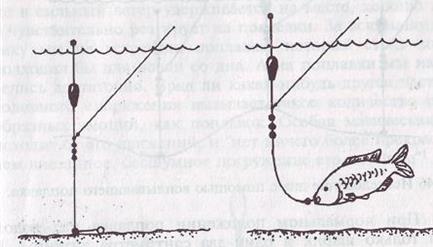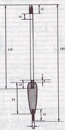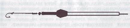 Рис. 6. Самоогружающийся поплавок Ю. Баличева Для ловли в корягах, среди водорослей или кувшинок мы используем самодельный скользящий самоогружающийся поплавок (рис. 6). В момент заброса он находится рядом с грузом, играющим роль нижнего стопора, так что масса груза и поплавка сосредоточена в одном месте. Это не только увеличивает дальность заброса по сравнению с оснасткой с фиксированным поплавком, но и повышает точность попадания в намеченное место, например в небольшое окошко среди водорослей.