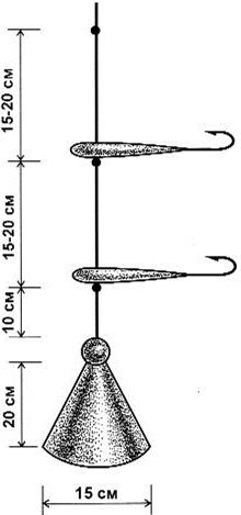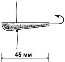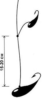 Рис. 5. Донная часть оснастки Длина такой приманки 45–50 мм, крючок опять-таки № 6–7 . Такой удочкой ловят примерно также, как ловят на мормышку окуня, то есть, держа удильник в руке и слегка поигрывая блесенками. Эта снасть обладает повышенной уловистостью. Главное ее достоинство в том, что ею играют как мормышечной снастью. Поэтому, нет смысла ставить над лунками несколько таких удочек. А вот как удочка – «разведчик» эта снасть себя в полной мере оправдала. Выбрал рыбак место, пробурил изначально одну лунку, опустил в нее снасть с блесенками (разумеется, насадив на крючок приманку) и стал ловить. Если последовали поклевки, есть смысл сверлить лунки и ставить корюшковые удочки, нет поклевок – надо менять место. Иной раз случается и такое, не успел опустить блесенки, как поклевка, вытащил корюшку, снова опустил удочку и опять удача. И тогда уже нет времени, да и необходимости выставлять другие удочки, можно и одной наловить больше, чем тремя. Если, конечно, повезет! Для ужения корюшки удобен и такой вариант: на конец подлеска вместо грузила, крепится крупная мормышка весом 20–25 г, с крючком № 7. Мормышка служит одновременно и грузом, и приманкой. Выше мормышки на 15–20 см подвязывается на поводке крючок или святящаяся мормышка (рис. 6).