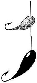 Рис. 3. Вариант оснастки с двумя мормышками (легкие пластмассовые с фосфорным покрытием) Применяются при ловле корюшки и небольшие удлиненные блесенки. Они напоминают собой малька и крепятся непосредственно на лесу без поводка в горизонтальном положении через отверстие посредине блесны. Такие блесны в магазинах не продаются, хотя на рынках и можно подобрать подходящие самоделки. Однако лучше смастерить их самому. Для этого потребуется раздобыть у кого-нибудь из приятелей сломанную телескопическую антеннку от транзисторного радиоприемника. От одного из колен этой антеннки, желательно из того, что потолще, отрезается трубочка длиной в 45–50 мм. Тонкой пилкой она разрезается на две половинки вдоль оси. Каждая их этих половинок обтачивается напильником на конус. Это будет верхняя часть блесны. Внутреннюю сторону заготовки следует хорошо обработать мелкой шкуркой, обезжирить и впаять в ее окончание крючок седьмого номера, так, чтобы его жало было повернуто вверх к наружной никелированной стороне заготовки. Обломок швейной иглы пробивается ближе к утолщенной части заготовки отверстия, через которое в готовой блесенке будет проходить леса. Затем иглу надо смазать вазелином и прибить этой же иголкой заготовку к какой-нибудь дощечке. Теперь осталось заполнить заготовку изнутри эпоксидной смолой и остановить все до полного затвердевания смолы.