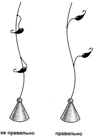 Рис. 2. Крепление поводков к подлеску Первый поводок подвязывают в 10–15 см выше грузила, второй еще на 15–20 см выше. Нужен ли третий поводок? Есть любители, оснащающие удочки тремя, а то и четырьмя крючками. Это ничем не оправдано. Редчайший случай, когда одновременно три корюшки зацепятся сразу на 3 крючка. Честно говоря, такого не видел. На два крючка – случалось. Рыболовы это называют «дуплетом». Так что от количества крючков вес улова мало зависит. А вот каждый дополнительный крючок неизбежно создаст и дополнительные трудности. Дело в том, что при вываживании корюшка бойко сопротивляется, мечется из стороны в сторону, стараясь уйти с крючка. И когда рыболов уже подтягивает добычу к лунке, верхний крючок очень часто цепляется за лед. Беда невелика: под тяжестью груза рано или поздно крючок вывалится из «ледового плена» и снасть от этого не пострадает, но корюшка уйдет. И чем больше на лесе крючков, тем чаще будет приключаться эта беда. Оптимальный вариант – два поводка, а значит и два крючка. Длина поводков не должна быть больше, чем 1–2 см. Длинный поводок может закрутиться вокруг лесы, а это уменьшит число поклевок. Крючки во всех случаях ставят № 6–7 (по отечественной нумерации). Это по размерам самый подходящий крючки для ловли корюшки. Таким образом, простейшая корюшковая снасть – это удильник, сторожок, леса, подлесок, грузило и два поводка с крючками седьмого номера. Доказано опытом многих рыболовов, что при хорошем клеве такая снасть обеспечит неплохой улов. Однако снасть может быть и усовершенствована. Рыболовами замечено, что стоит обернуть цевье крючка кусочком фольги (лучше красного или зеленого цвета) и количество поклевок на такой «усовершенствованный» крючок возрастает. Может быть, именно эти наблюдения и привели к рождению корюшковых мормышек. Тут уж не может быть двух мнений: мормышечная снасть намного уловистее снасти с обычными крючками. Правда, мормышки, применяемые для лова корюшки, – особые, отличающиеся от окуневых. Корюшковые мормышки – легкие, изготовлены из эпоксидной смолы или другой какой-либо пластмассы и покрыты светлым красителем с добавлением фосфоресцирующего состава. В темноте такая мормышка светится. Позднее умельцы стали производить и комбинированные двух, и даже трехцветные светящиеся мормышки. Надо признать, что легкие светящиеся мормышки пришлись по вкусу корюшке и ныне абсолютное большинство корюшатников применяют на своих удочках именно такие мормышки. Но и на них ставится крючок № 7. Длина поводков тоже остается прежней – 1–2 см (рис. 3).