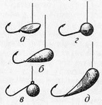 Рис. 3. Мормышки: а — «Капелька» комбинированная (из свинца и фольги); 6 — «Капелька» литая, свинцовая; в — «Дробинка» без отверстия (крючок припаян сверху); г — «Дробинка» с отверстием; д— «Уральская» с выемкой для лучшей зацепистости Успешнее всего эту рыбу ловят на мормышку вытянутой формы, типа «Капельки» или «Уральской» (рис. 3, б, д). Можно применять и «Дробинку», но с условием, что крючок будет далеко высовываться из тела приманки. Мормышка без насадки должна висеть на леске почти горизонтально с очень маленьким наклоном, а с насадкой — под углом 45° (рис. 4, а). Крючки применяют № 3,5–5.