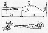 Рис. 5. Приспособление для вязания мотылей в пучок — «вязалка» Разумеется, нужно по мере надобности пополнять количество прикормки на дне. Свежий и живой мотыль быстро закапывается в ил. Поэтому, набивая кормушку личинками, полезно их хорошенько прижать, чтобы часть раздавить: запах быстро распространится в воде и привлечет рыбу. Если позволяет глубина и отсутствует течение, во время ловли прикормку лучше подсыпать прямо в лунку небольшими порциями, но почаще. Кормушка резко открывается у дна и может отпугнуть такую осторожную рыбу как лещ. В любительском рыболовстве бытует порочная практика прикармливать леща хлебными продуктами: сухарями, различными кашами. Спортсмены такие прикормки не применяют, прежде всего из соображений этических. Уместно также отметить, что такая прикормка гораздо хуже мелкого мотыля. Надеюсь, что мои заметки читают не только спортсмены, но и рыболовы-любители, и они прислушаются к этому неоднократно проверенному мнению. (О.Я. Соболев) | |