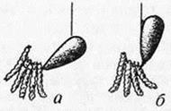 Рис. 4. Угол наклона мормышки с насадкой: а — правильно; б — неправильно Техника ловли леща зимойКак уже говорилось, при ужении леща предпочтительнее плавные колебания мормышки и замедленная проводка. Он чаще, чем другие рыбы, берет насадку со дна. Обычно это выглядит так: рыболов в течение нескольких минут безрезультатано играет приманкой, но стоит положить ее на дно, как сразу или через несколько секунд следует уверенная поклевка, приподнимается не только кивок, но и часть лески у кивка. Правда, нередко так клюют и иные рыбы, особенно плотва, но лещ — только так. Недаром такая характерная поклевка называется лещовой, даже тогда, когда подобным образом со дна берет ерш. Впрочем, лещ часто поднимает кивок и в том случае, когда он взял приманку в метре от дна и выше. Если подсечка оказалась неудачной (рыба сошла), то по типичной поклевке можно с большой долей достоверности предположить, что брал лещ, и поспешить с прикормкой, чтобы удержать его на месте ловли. Следует помнить, что лещ привыкает к однообразной плавной игре мормышки и в какой-то момент, по-видимому, теряет к ней интерес. Поэтому полезно в таких случаях периодически менять темп проводки, частоту и амплитуду колебаний мормышки. Эффективен такой прием: сильно потрясите мормышку на одном месте вблизи дна, потом резко прекратите игру, опустите мормышку на дно и тихонько пошевеливайте ее. Или другой способ: выполняйте проводку сверху вниз — бывает, что лещ берет приманку на спуске. Только при этом не торопитесь с подсечкой — надо подсекать не в тот момент поклевки, когда мормышка как бы преждевременно коснулась дна, а с маленькой паузой, примерно в секунду или две, иначе будет много пустых поклевок. Вообще, при ловле этой рыбы, особенно если у вас обостренная реакция на поклевку, следует всегда делать маленькую паузу, так как лещ (как и большинство карповых) вначале пробует корм, а потом уже его заглатывает, хотя эти этапы может разделять очень короткий промежуток времени. Современная спортивная снасть настолько чувствительна, что регистрирует малейшие прикосновения к приманке. По этой причине начинающие спортсмены часто ошибаются, реагируя на «подергунчики» — дегустирование лещом насадки. Хотя длина лески и ее амортизационные свойства допускают подсечку любой силы, злоупотреблять этим не следует: закрепляется вредный навык сильной подсечки, что отрицательно скажется при ужении на мелководье — участятся обрывы снасти. Несильную подсечку компенсируют интенсивным вываживанием, в процессе которого крючок сам войдет глубоко в губу, что предотвратит сход рыбы. Подсеченный лещ в толще воды ведет себя довольно спокойно, но на подходе к лунке делает отчаянные рывки. Они не угрожают прочной снасти, если рыба не превышает 300 г. Более крупную добычу приходится, вываживать с осторожностью, несколько раз останавливая и выбирая леску, зажатую между большими и указательными пальцами обеих рук, так как из одной леска может вырваться при резком броске рыбы. Обычно правой рукой создают натяжение, а левой страхуют и временами чуть подтормаживают. Нередко случается отпускать леща на 3–4 м. При этом многие рыболовы, как завороженные, смотрят в лунку. Занятие это бесполезное. Надо научиться сосредоточивать внимание на снасти и на поведении рыбы и выработать мгновенную реакцию на устране