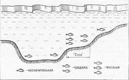 Лещ, как известно, рыба глубоководная. Только после ледостава и по последнему льду он попадается на глубине 2–3 м. С нарастанием толщины льда перемещается на постоянные места зимовки — в русла затопленных рек, глубокие канавы и овраги, подводные ямы и затопленные пруды. Пожалуй, больше других рыб он привязан к бровкам — кормится непосредственно на них или где-нибудь поблизости. Все его кормовые «тропинки» проходят по бровкам. Опытные рыболовы утверждают, что причину такого явления надо искать в широкотелости леща — ему удобнее брать пищу с наклонной плоскости. Может быть. Хотя, думаю, не исключены какие-то другие факторы, о которых мы пока не знаем. Учитывая склонность леща к бровкам, спортсмены первым делом ищут именно такие места. Надо лишь помнить, что и на бровках бывают различные участки, одни из которых лещи посещают чаще, другие — реже. Например, если на крутой бровке есть небольшой «столик» (рис. 1), то они концентрируются здесь, и ловля тут будет успешнее. Интересно, что лещ частенько избегает максимальной глубины в русле реки; особенно это заметно ближе к середине зимы, когда начинается интенсивное гниение растительности. В такое время никакая прикормка не заставит леща опуститься на дно и в русле его зачастую ловят вполводы (1 м и более до дна). Рис. 1. Плотность концентрации леща в зависимости от рельефа дна Каков же тактический план ловли леща? Если окунь, ерш, плотва могут оказаться в любой части зоны, то леща надо искать на глубине. Исследование рельефа дна следует начинать с глубины 3–5 м (в зависимости от средней глубины водоема, где проходят соревнования) и сверлить лунки с интервалом 10–15 м в направлении к самой глубокой части зоны, стараясь как можно быстрее обнаружить бровку. В случае неудачи нужно продолжить поиск поперек зоны в надежде найти поперечную бровку. Малейший перепад глубин служит сигналом к тому, чтобы сосредоточить на нем свое внимание и, просверлив несколько лунок, постараться уточнить характер изменения дна. Все промеры надо выполнять глубомером. Многие спортсмены в погоне за двумя зайцами совмещают обследование дна с ловлей в каждой лунке, запоминая глубину, на которой произошли поклевки. Такой тактический прием малоэффективен и, как правило, ведет к большим потерям времени. Ознакомившись с характером дна, надо наметить участок ловли и опробовать наиболее перспективные лунки. В ту, где будет поклевка или удастся поймать рыбу, следует опустить прикормку (50–70 г мелкого мотыля). Если на крючок попался окунь или плотва, необходимо перейти на большую глубину. Замечено: там, где держится лещ, присутствуют также ерш или судак, другие рыбы этих мест избегают. Известно, что лещ подходит к прикормленной лунке не сразу, а минут через 20–30. Поэтому, опустив прикормку и обозначив лунку флажком, продолжают поиск на той же глубине, но в другой (на ваш взгляд, тоже перспективной) части зоны, а через 20–30 мин. возвращаются на прежнее место. Если лещ подошел, он с первых же движений приманки даст о себе знать. Обычно поклевки бывают очень решительными, но после поимки нескольких рыб клев замирает, хотя лещи продолжают интересоваться мормышкой, что выражается в осторожных потрагиваниях насадки. Кивок регистрирует х как незначительные подъемы или резкие короткие рывки, которые рыболовы называют «подергунчиками». Види